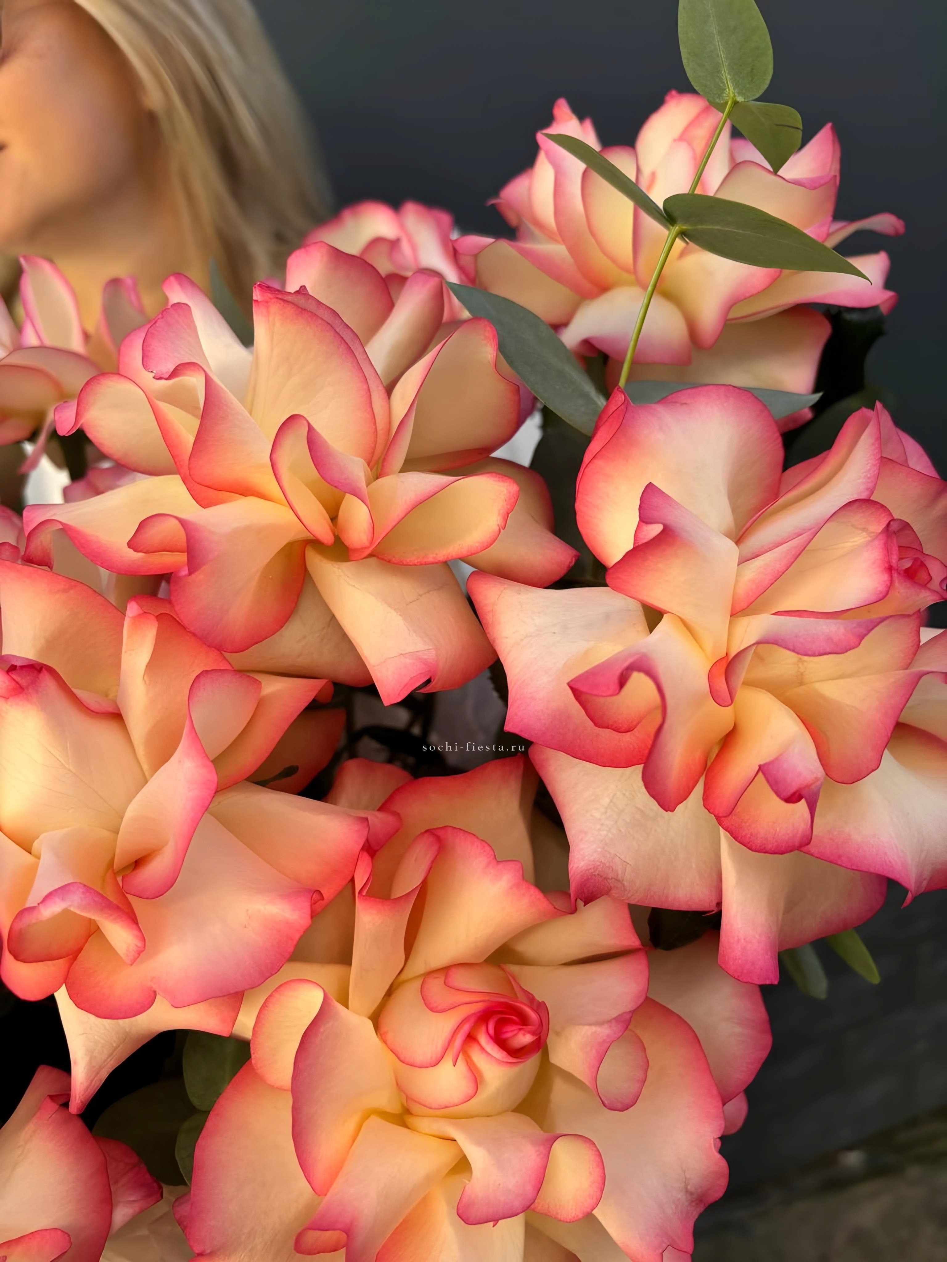 Пятнадцать вывернутых роз Джумилия раскрывают свою многослойную структуру в каждом бутоне. Эвкалипт обрамляет композицию, подчёркивая фактуру лепестков.
