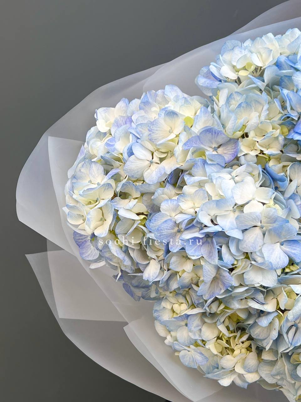 Пять соцветий необычного голубого оттенка образуют воздушную композицию. Гортензии притягивают взгляд своей редкой палитрой и мягкой фактурой. Монобукет для ценителей нестандартных решений.