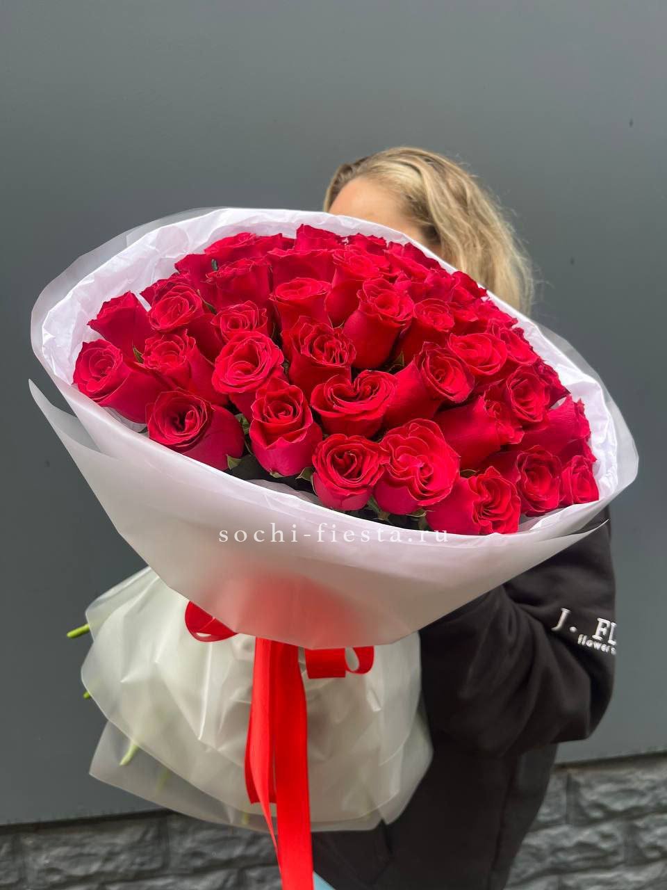 55 красных роз, лента, упаковка.