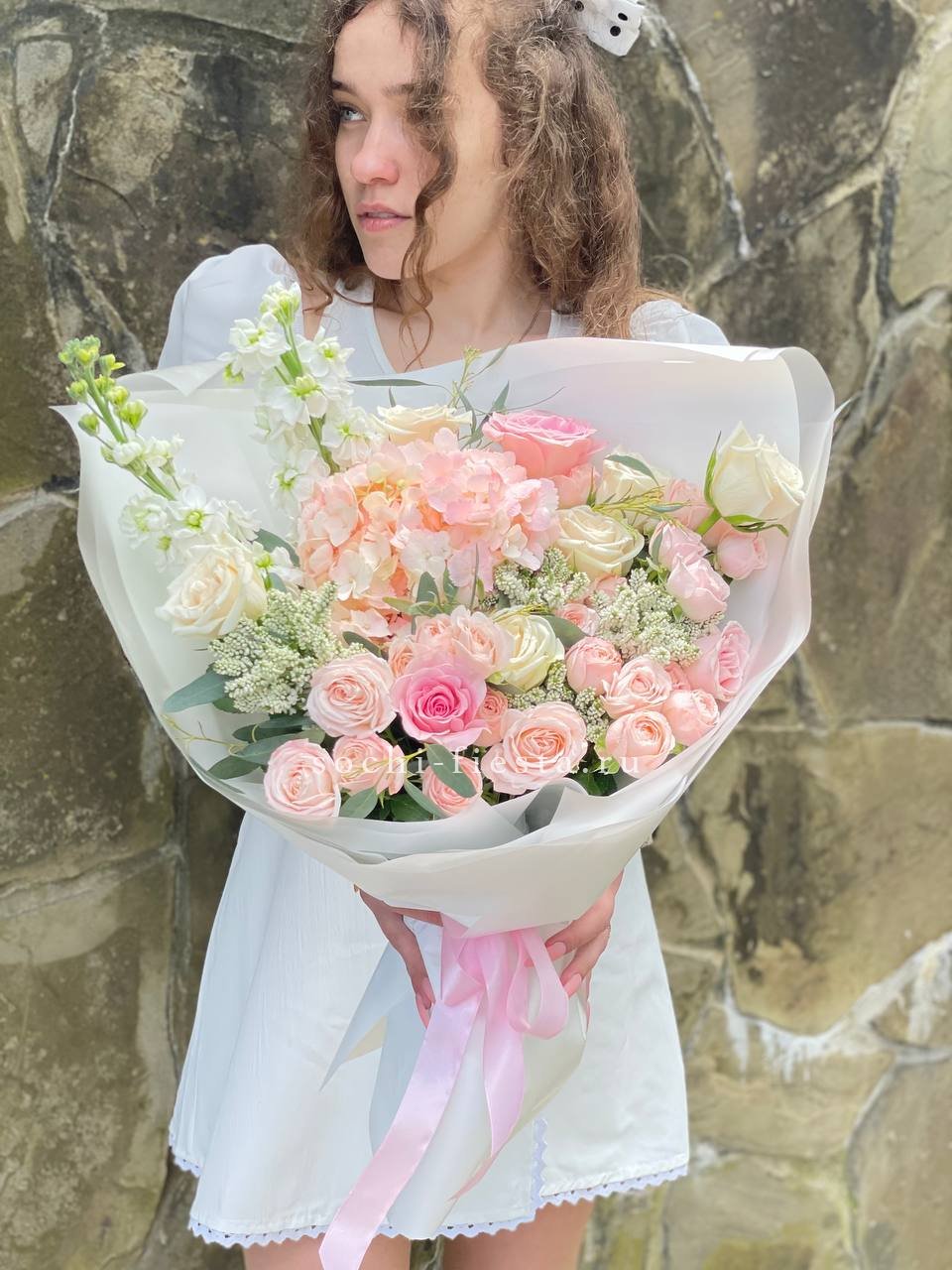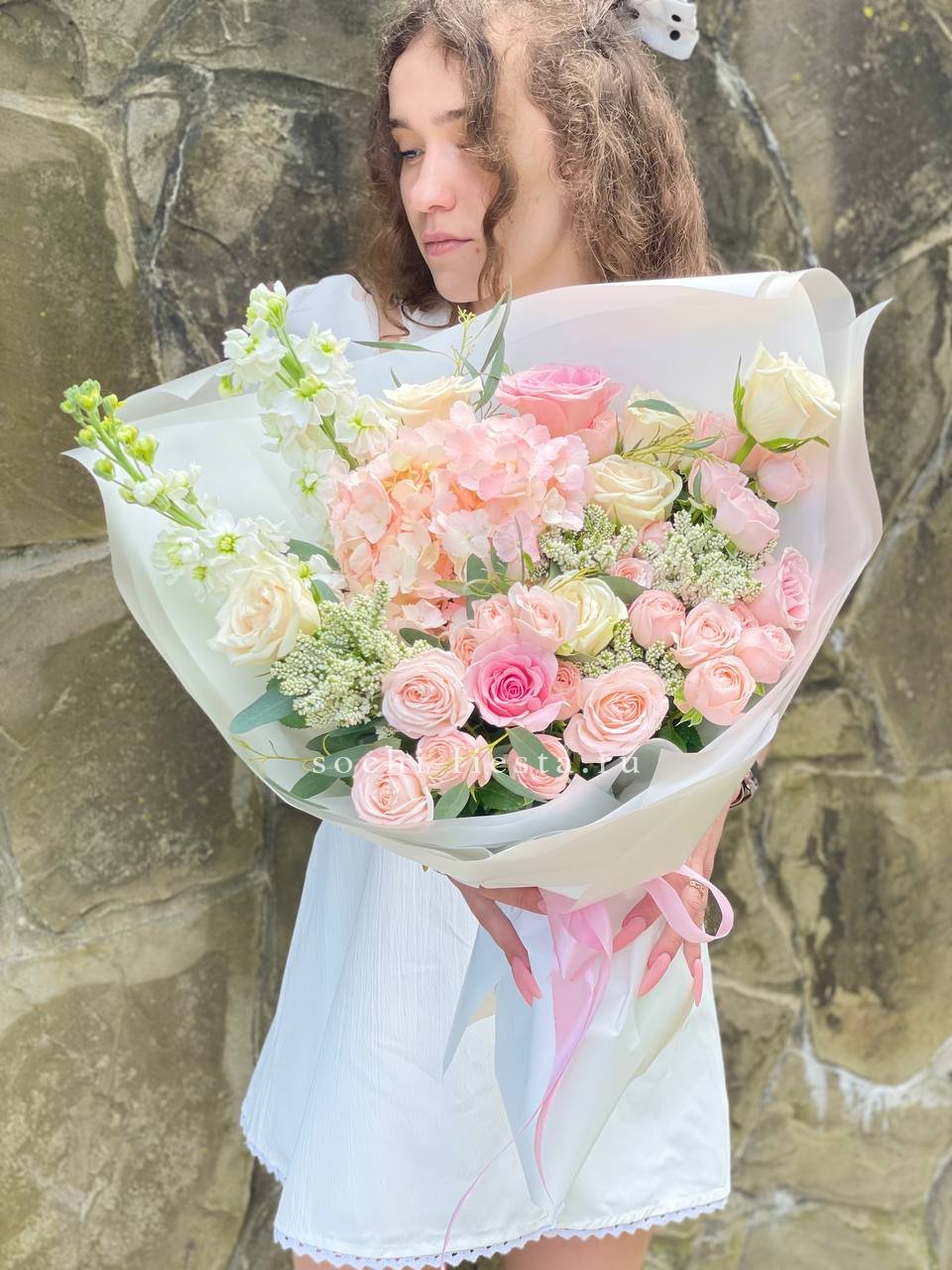 гортензия нежно-розовых оттенков, эустома, львиный зев или маттиола, розовые розы, эвкалипт, вспомогательная зелень, лента, светлая корзин.