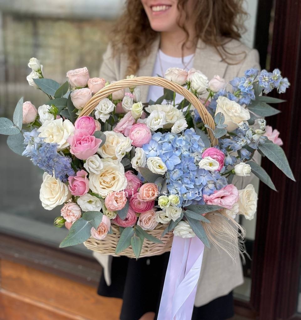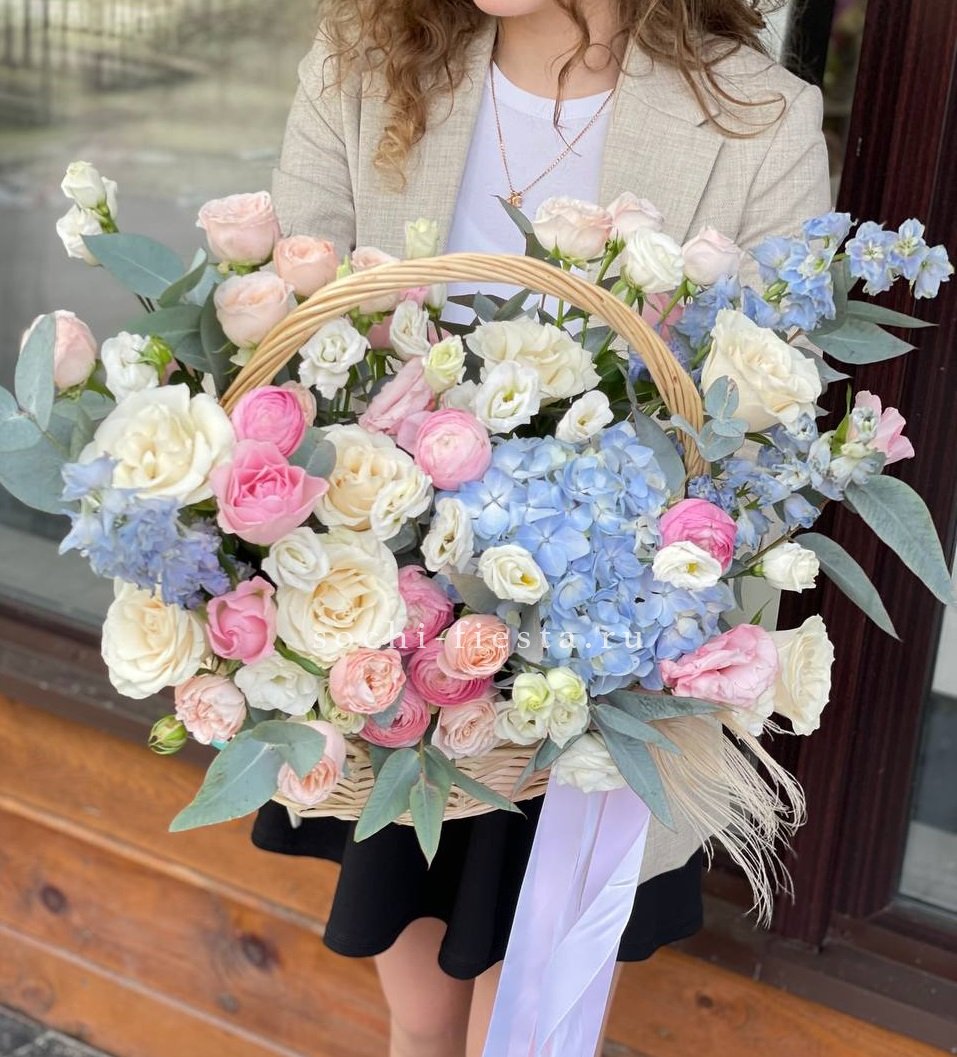 Пышная композиция объединяет крупные соцветия гортензии с бархатными розами и воздушной эустомой. Мисти бабблс и диантус создают мягкую дымку вокруг центральных бутонов. Веточки эвкалипта добавляют свежести и завершают образ.