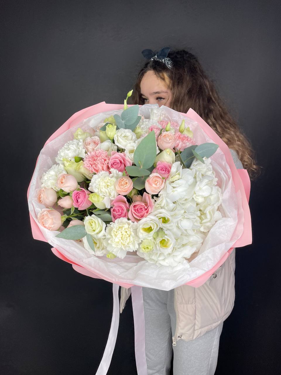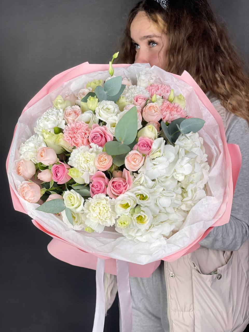 Одиннадцать вывернутых бутонов WhiteNice раскрываются волнами лепестков с матовым свечением. Эвкалипт добавляет воздуха между соцветиями.