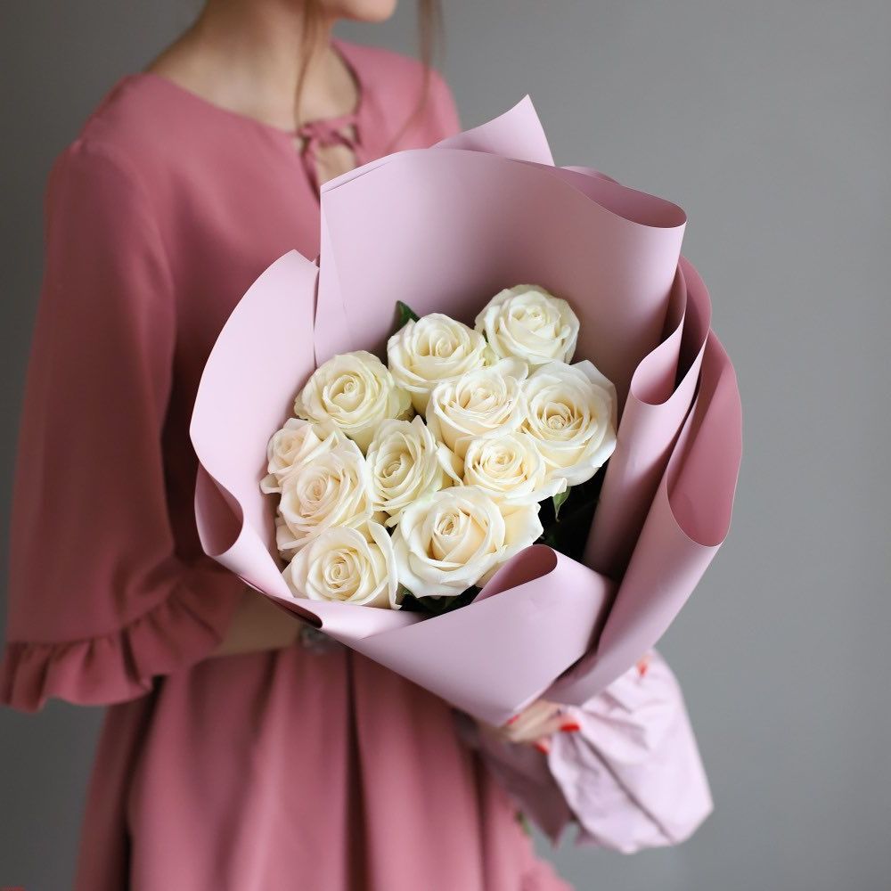 Одиннадцать белых бутонов собраны в компактную форму и обрамлены розовой бумагой. Чистый цвет и аккуратная сборка создают спокойное впечатление.