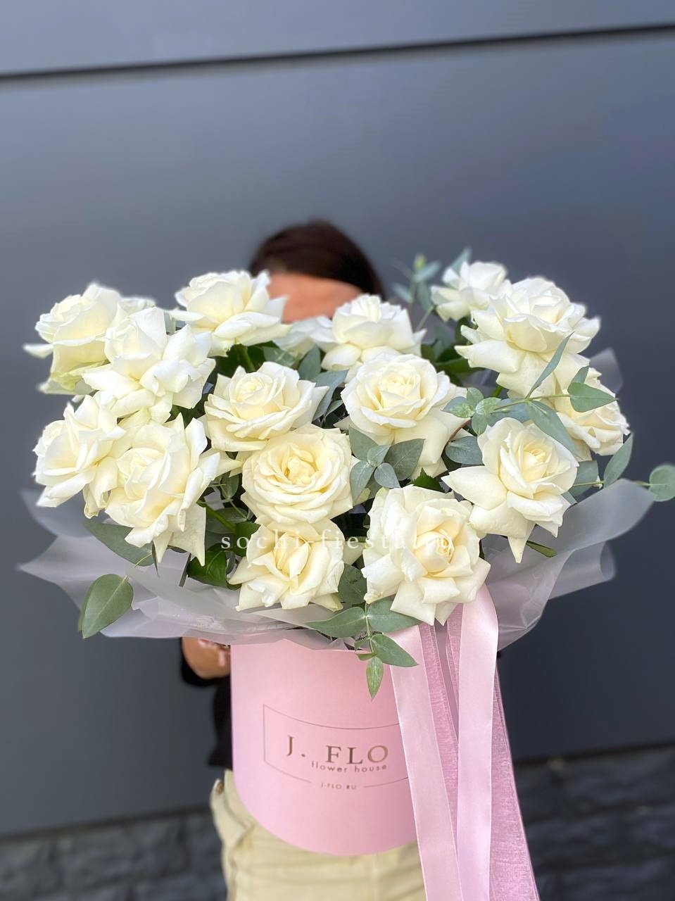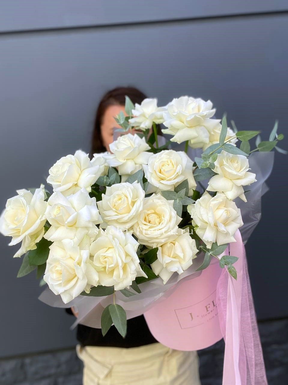 Белоснежные бутоны собраны в лаконичную форму с воздушной текстурой упаковки. Чистота линий и свежесть делают композицию универсальной для любого момента.