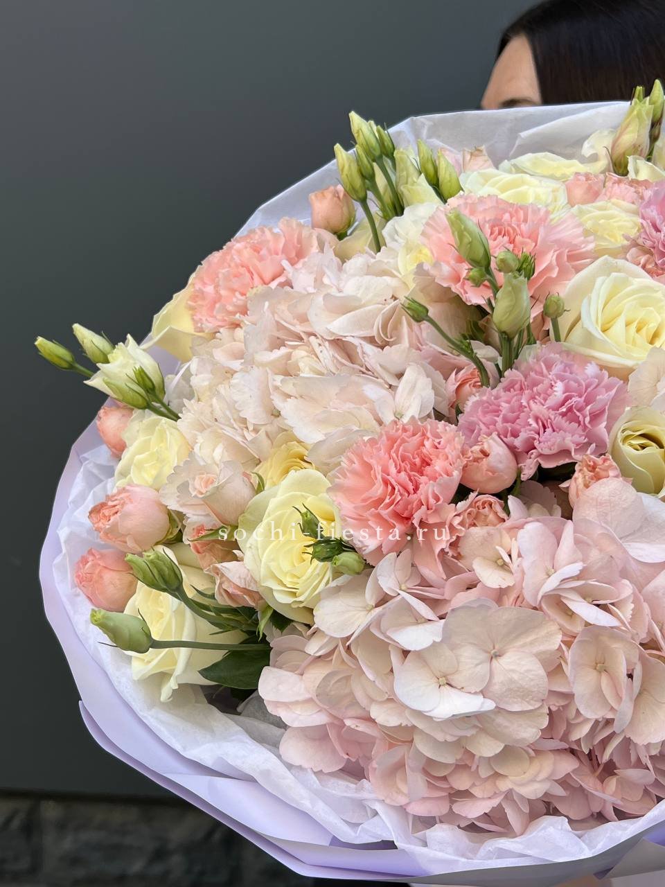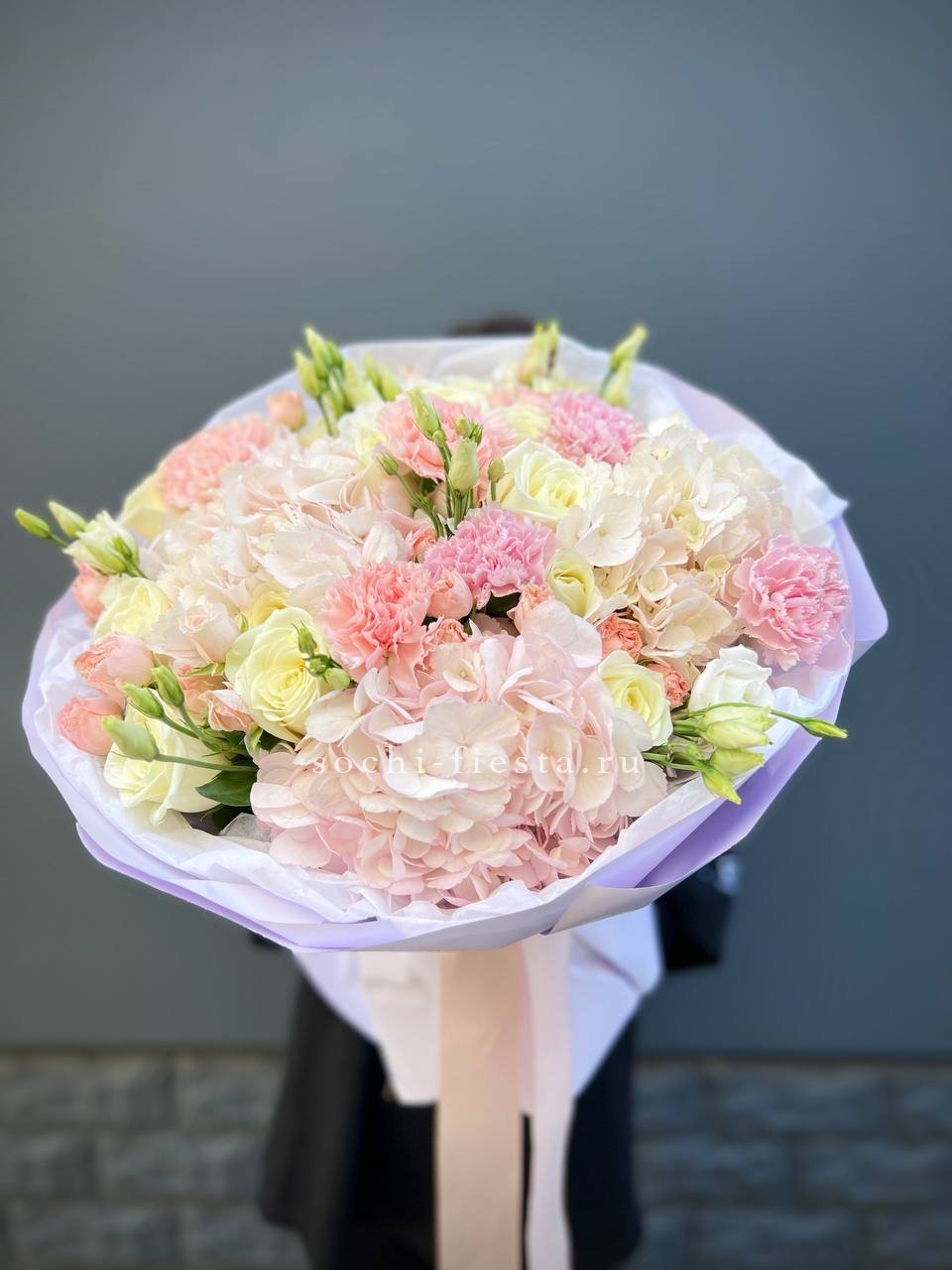 Крупные шапки гортензий формируют основу композиции, розы и эустомы заполняют пространство между ними. Диантусы добавляют графичности. Букет с впечатляющим присутствием и богатой палитрой.