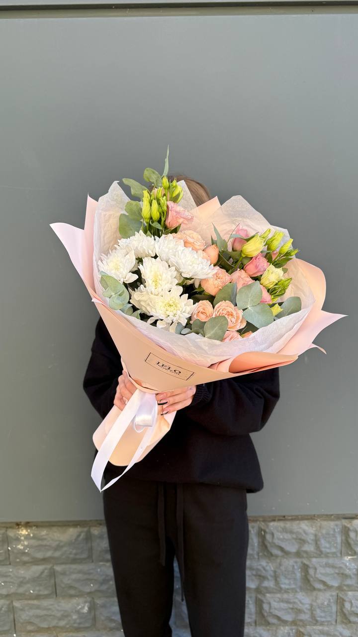 Авторский микс в персиковых тонах — идеальное дополнение к вашему особенному дню. Сочетание фактурных хризантем и бархатистых роз создает ощущение легкости и тепла. Букет, который не просто украшает пространство, а дарит искреннюю улыбку.