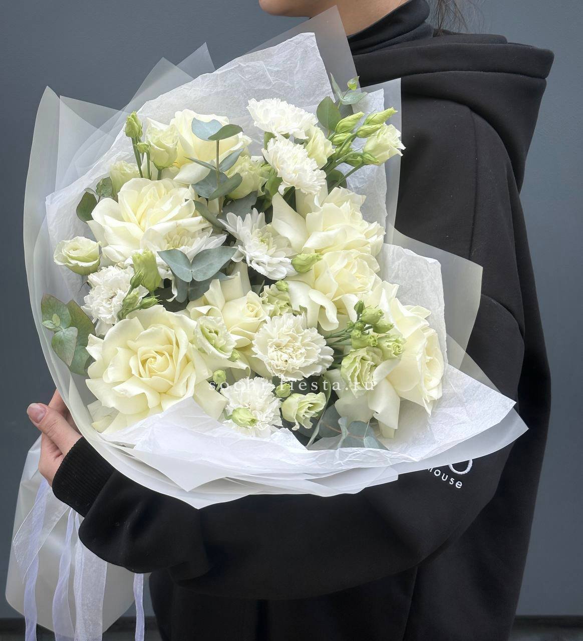 белые розы, диантус, хризантема кустовая, эустома, эвкалипт, лента, авторское оформление.