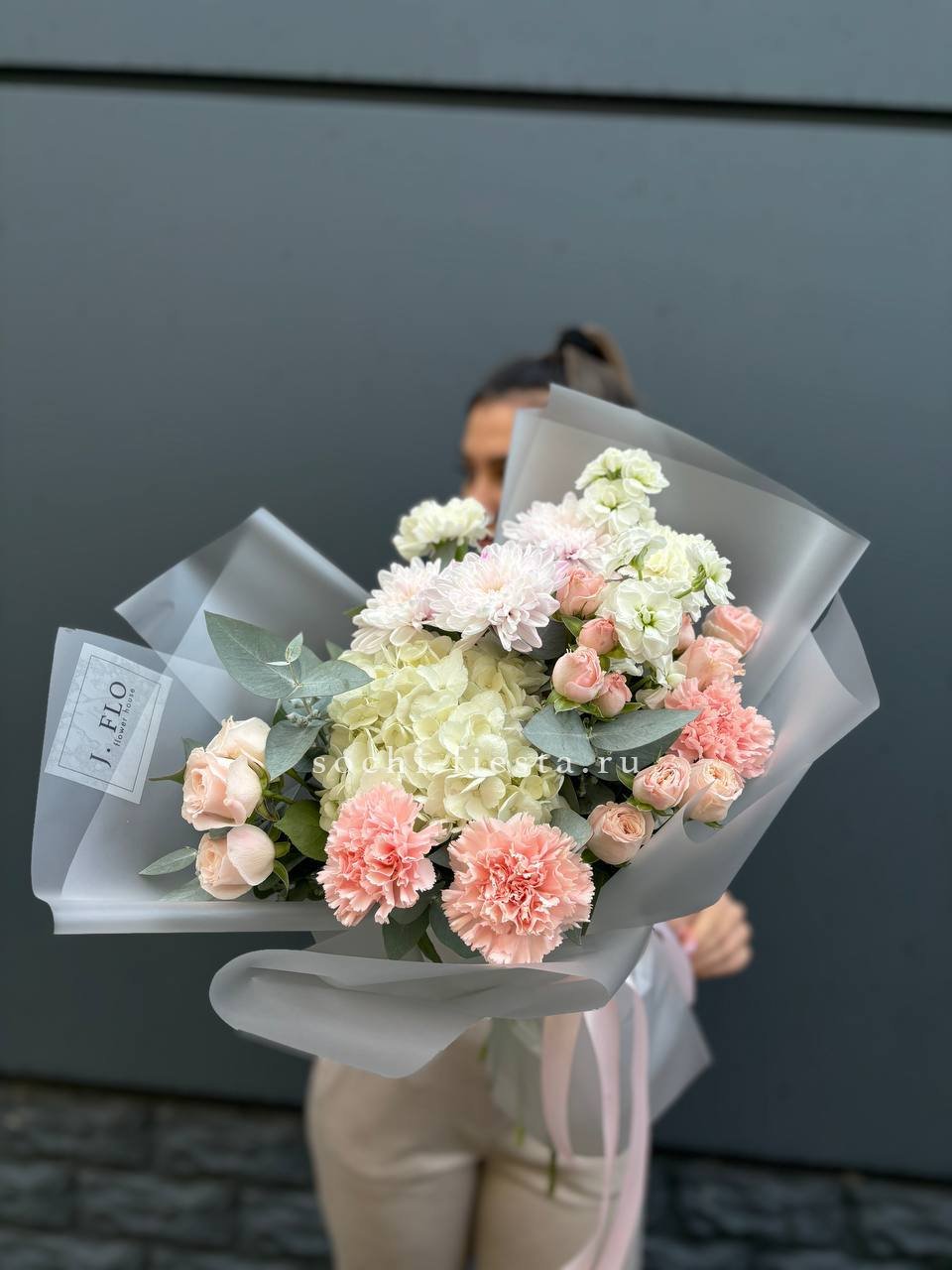 гортензия, диантусы, маттиола или замена в несезон, бомбастик, хризантема в воздушном оформлении.