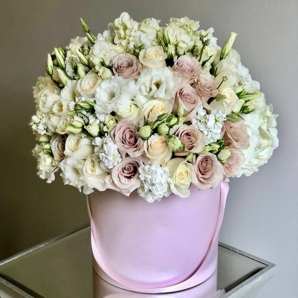 роза белого и розового оттенка 555 шт., оформление в каркас или корзину.