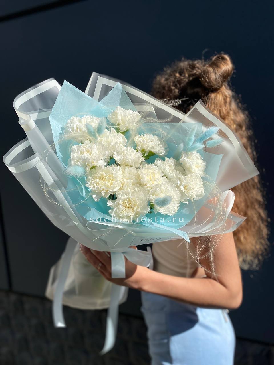 15 белых диантусов,ковыль,лагурус, эвкалипт, лента, дизайнерская пленка.