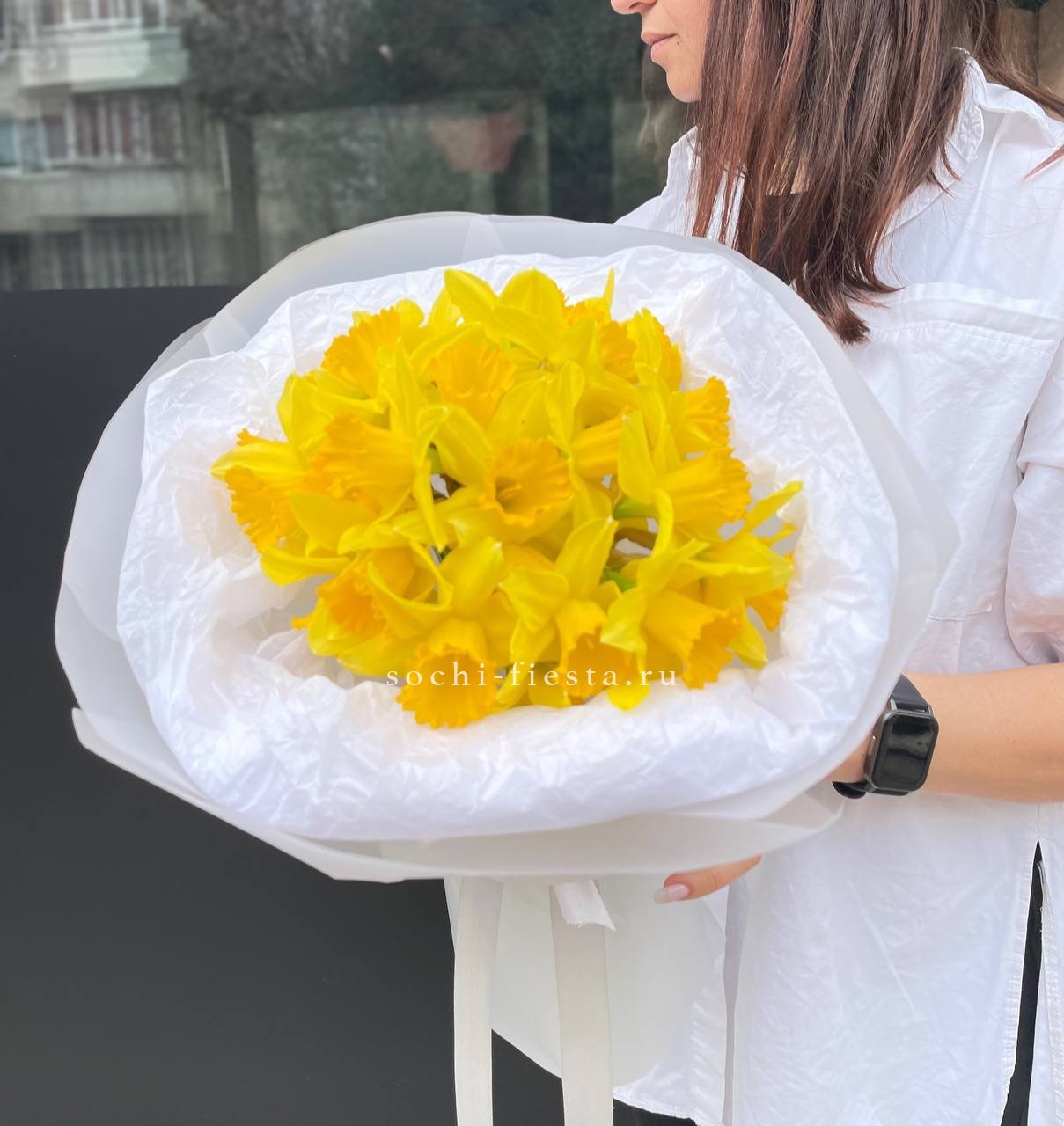 Состав: нарциссы 25шт, лента, дизайнерская упаковка, тишью