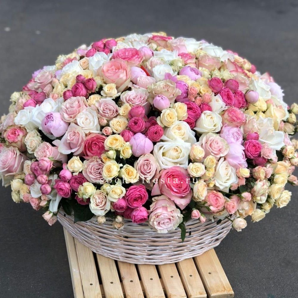 Корзина объединяет пышные пионы и махровые кустовые розы в единую композицию. Бутоны разной степени раскрытия создают живую фактуру с глубиной и воздухом между соцветиями.