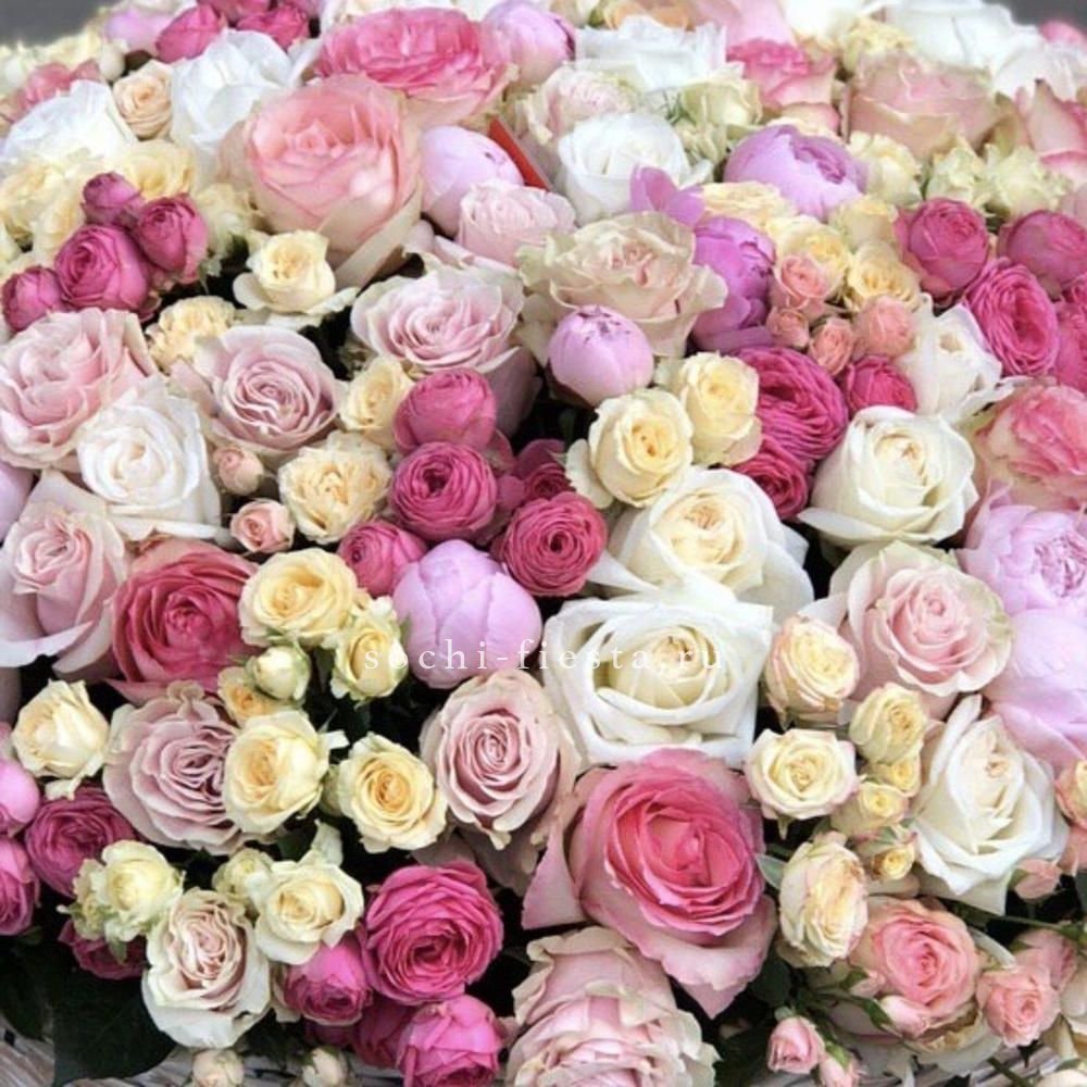 пионы в зависимости от сезона, возможна замена, розы кустовые пионовидные, розы одноголовые.