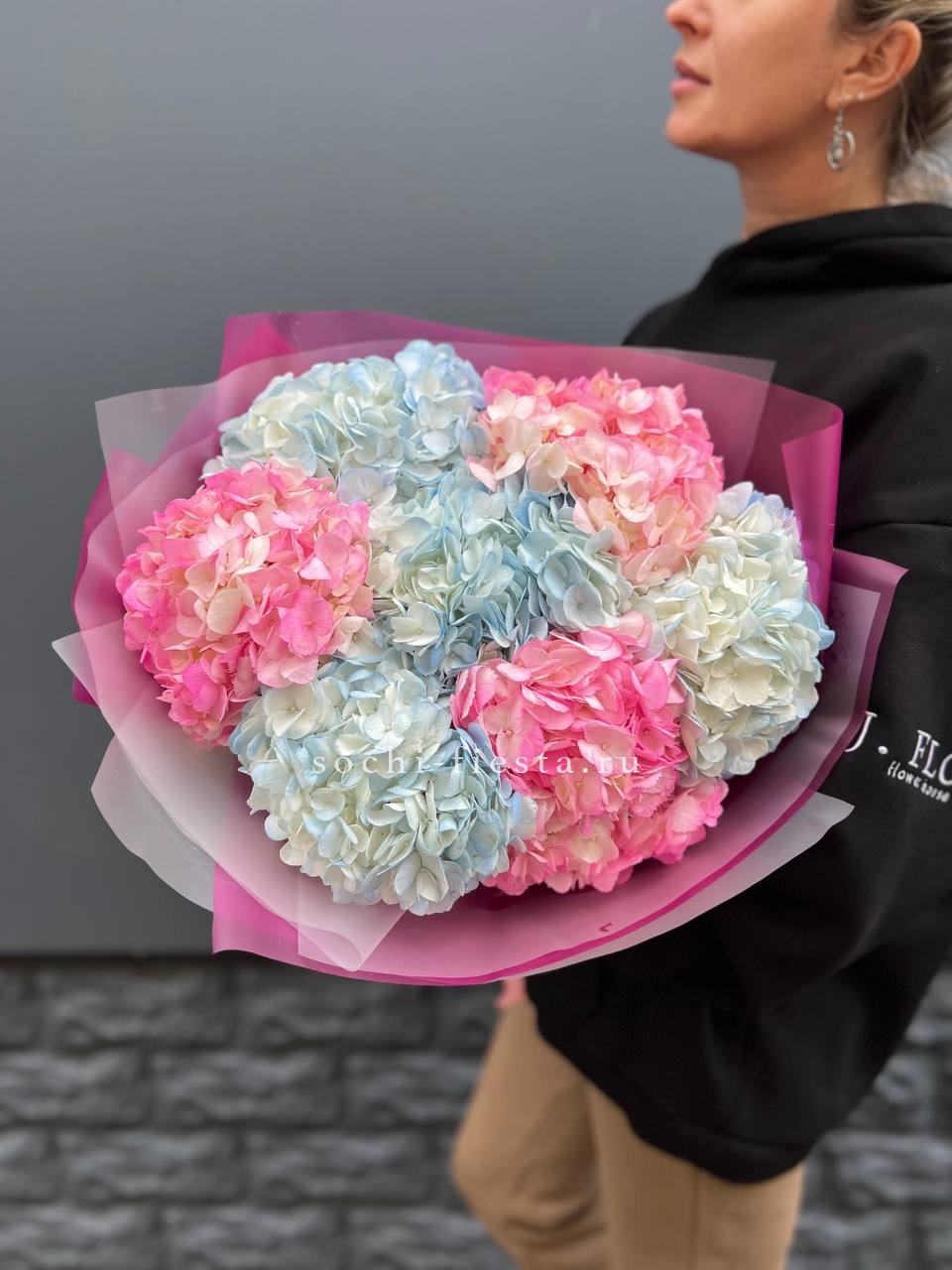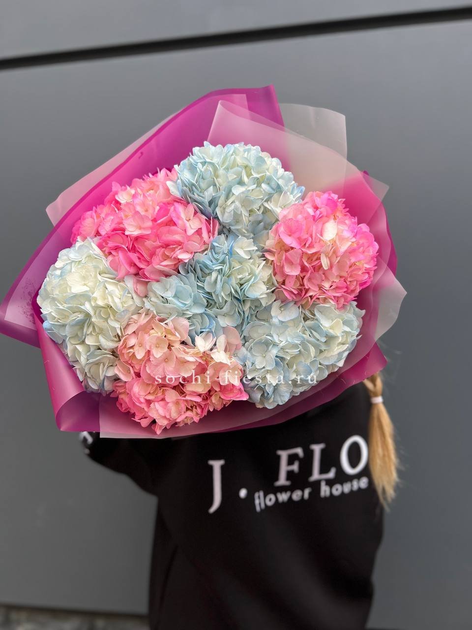 Букет из семи гортензий объединяет разные оттенки в единую композицию с живым ритмом. Переходы цвета создают динамику, а плотные соцветия формируют выразительный объём.