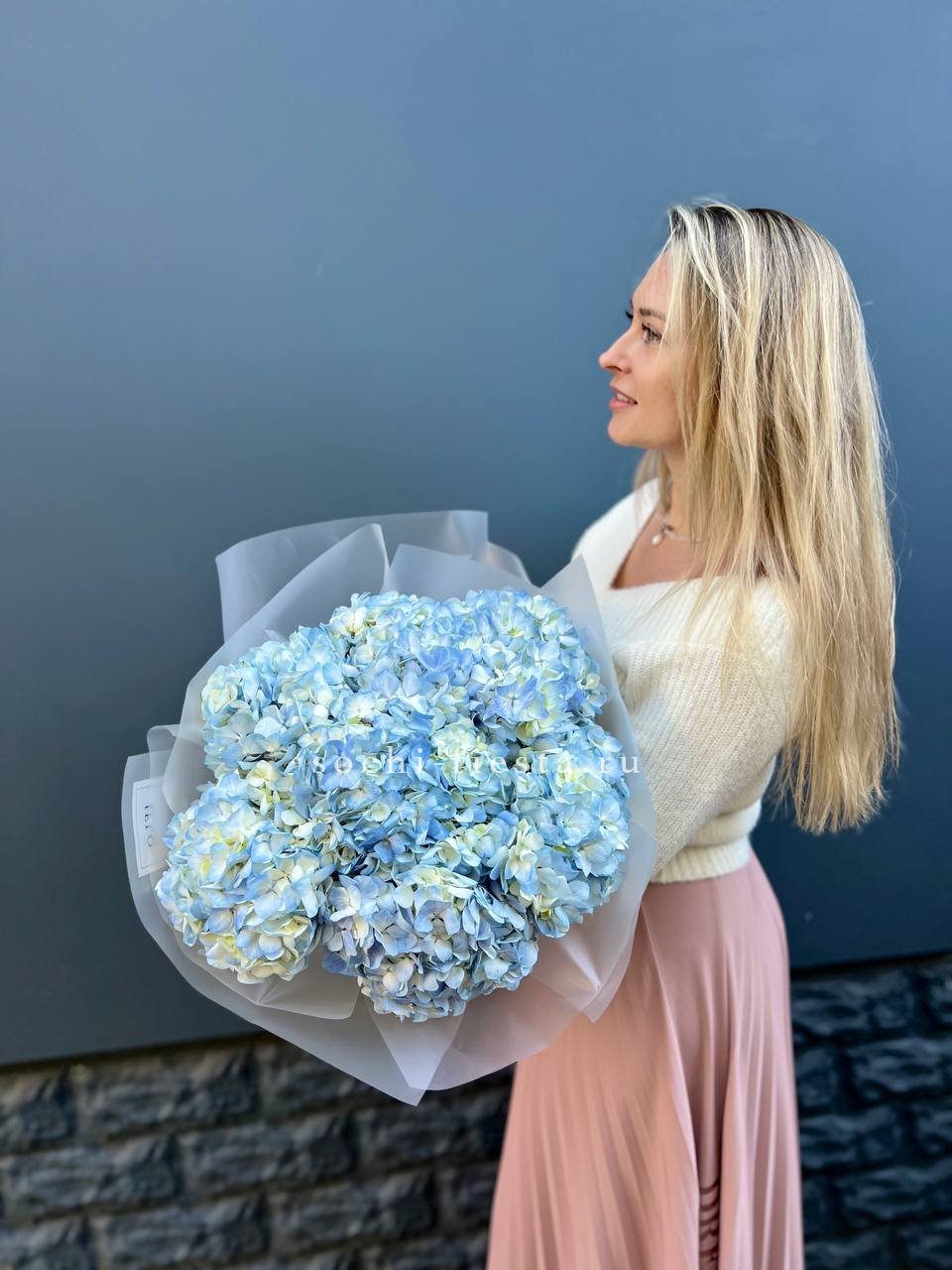 Голубые облака гортензий раскрываются воздушными шапками и удерживают взгляд игрой оттенков. Каждое соцветие дополняет соседнее создавая объемную композицию с характером.