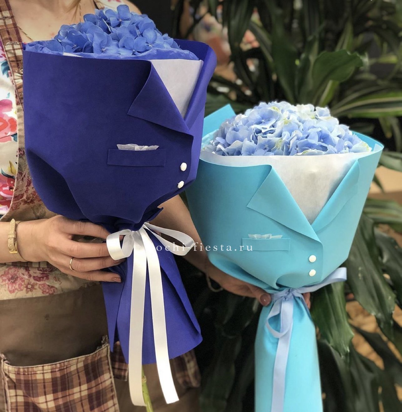 Гортензия в дизайнерской упаковке с текстильным акцентом выглядит современно и лаконично. Необычная подача придаёт букету характер, делая его запоминающимся дополнением момента.