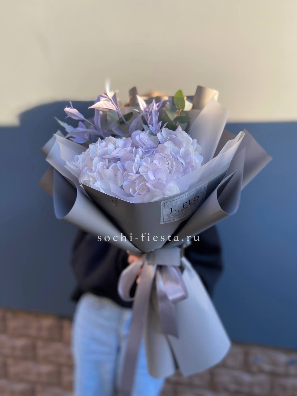 гортензия, эвкалипт, лента, дизайнерская упаковка.