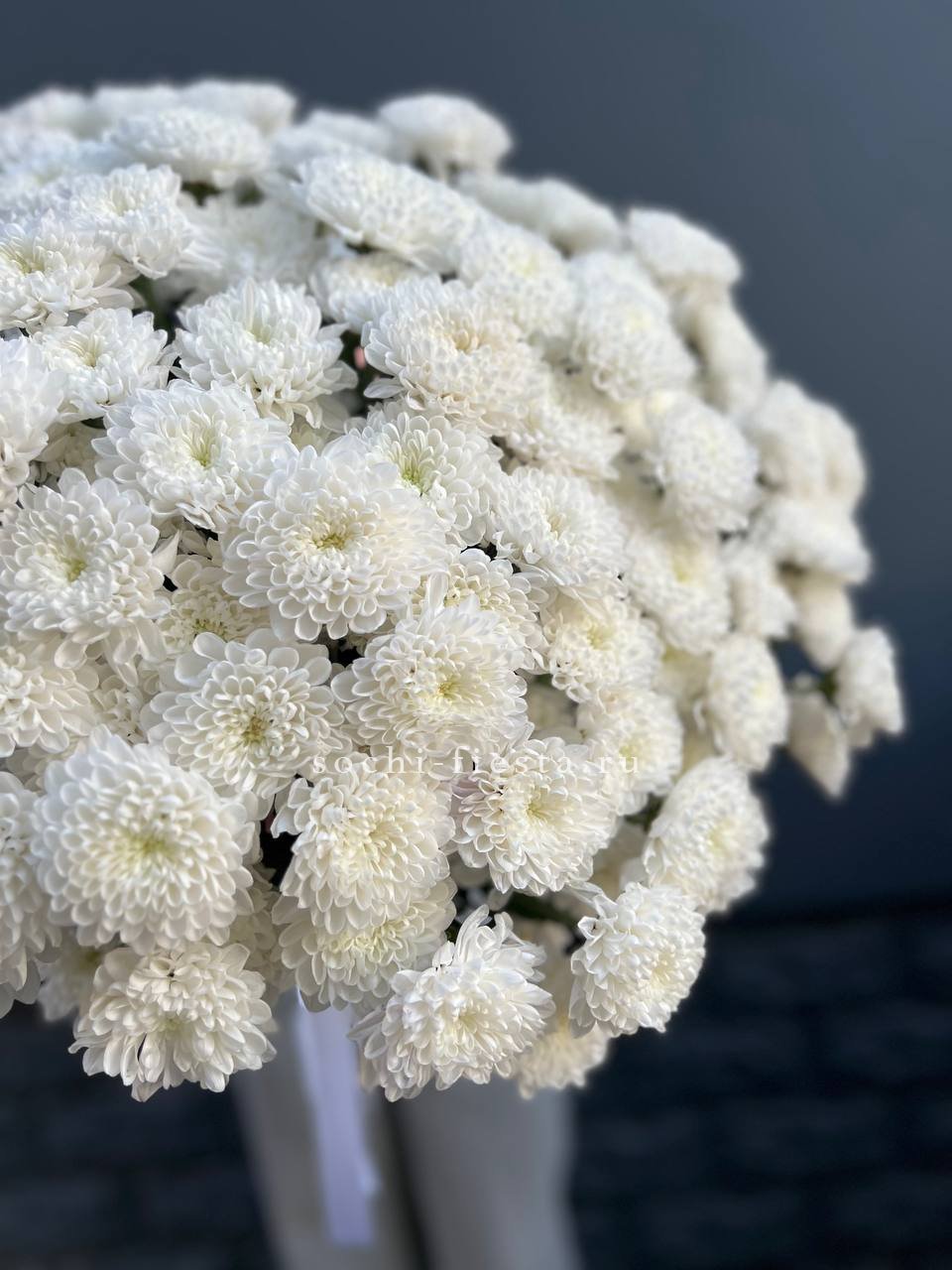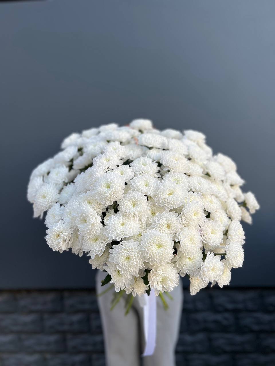 Белоснежные кустовые хризантемы раскрываются мягкими шарами соцветий. Чистота линий и спокойный ритм бутонов создают ощущение воздуха и света.
