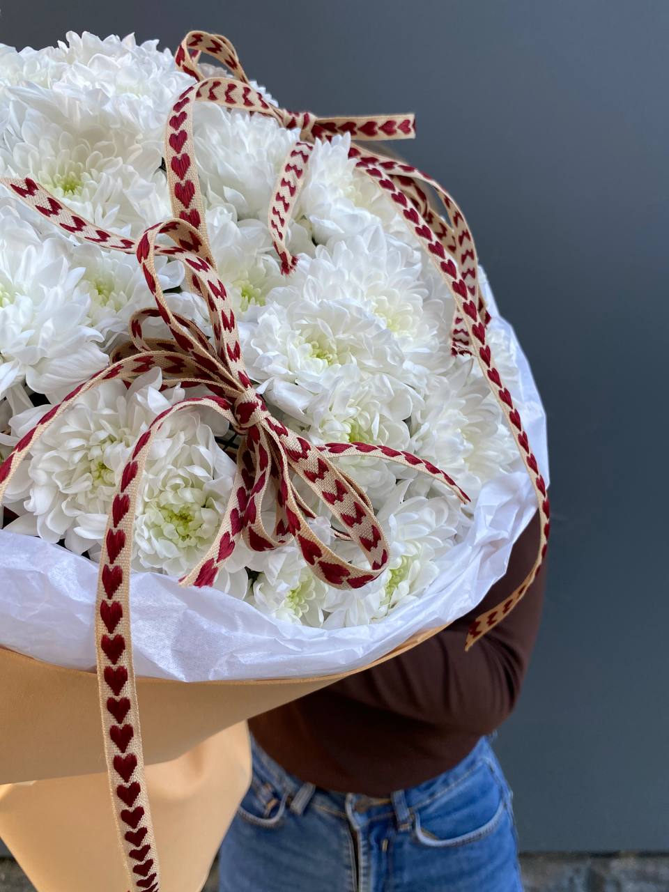 Семь хризантем собраны в плотную округлую форму и украшены бежевой упаковкой с тремя тонкими бантами. Сердечки на лентах добавляют композиции трогательности. Букет держит форму и выглядит аккуратно в руках или в вазе.