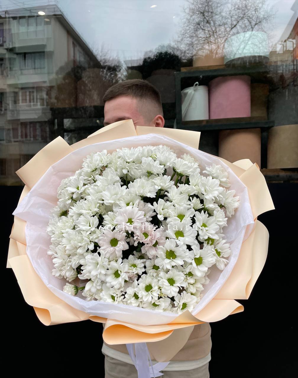 Крупные головки хризантем дополнены воздушными метёлками ковыля. Лаконичная упаковка сохраняет естественную красоту цветов и позволяет разместить букет в любом пространстве.