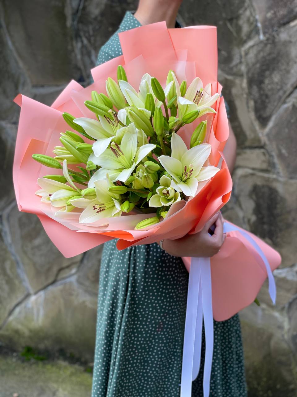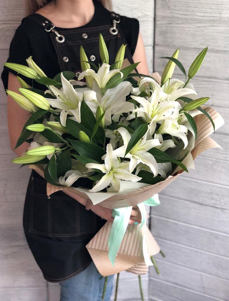 Пять белых лилий в крафтовой обёртке — классика без лишних деталей. Бутоны крупные, с выраженной фактурой лепестков и насыщенным ароматом. Простая форма букета подходит для любого повода и интерьера.