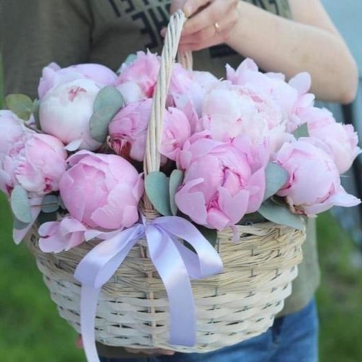 Пятнадцать пионов раскрываются мягкими волнами лепестков среди серебристой зелени эвкалипта. Корзина сохраняет аккуратность линий и свежесть цветов надолго. Компактная форма для любого пространства.