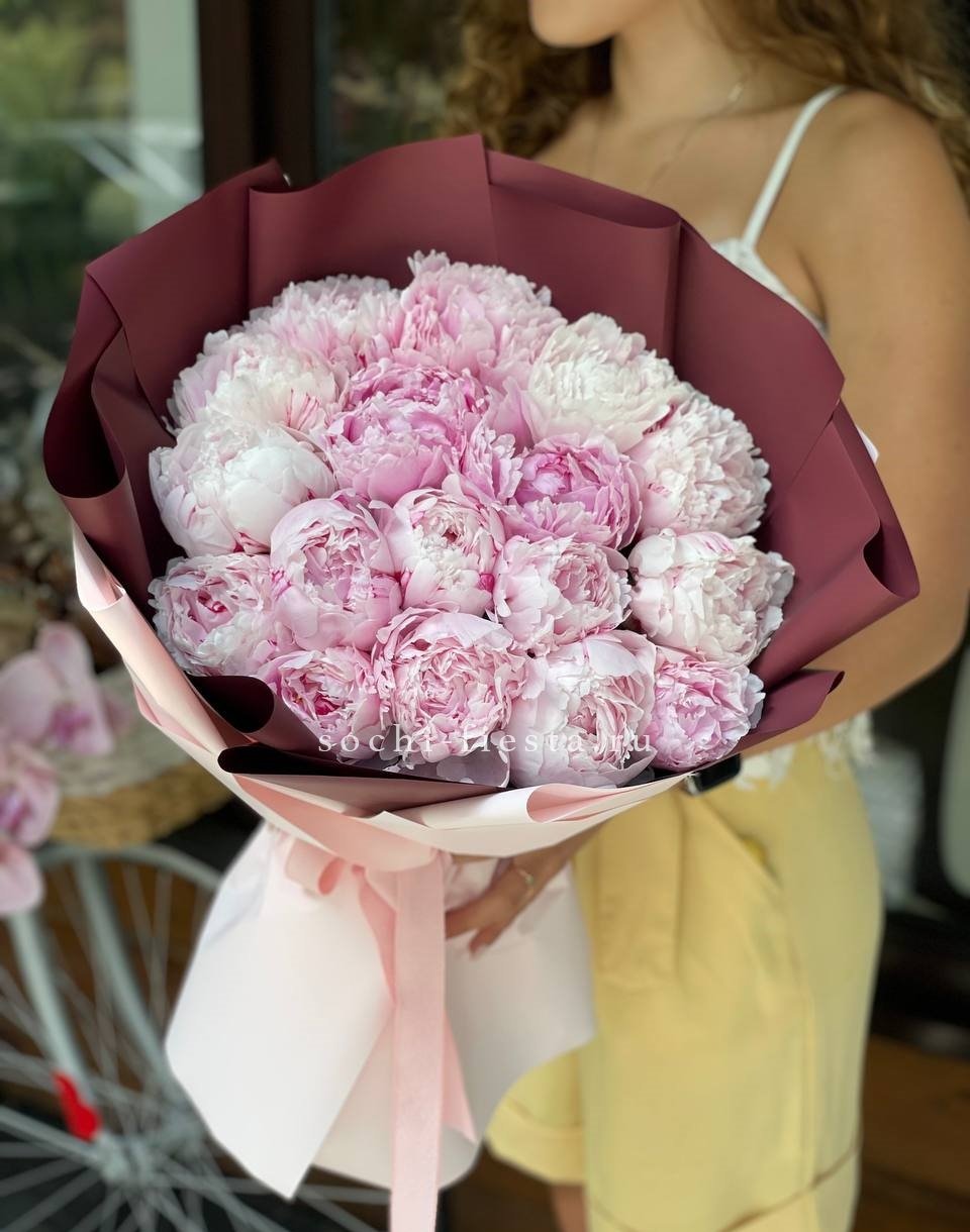 17 пионов, лента, дизайнерская упаковка.
