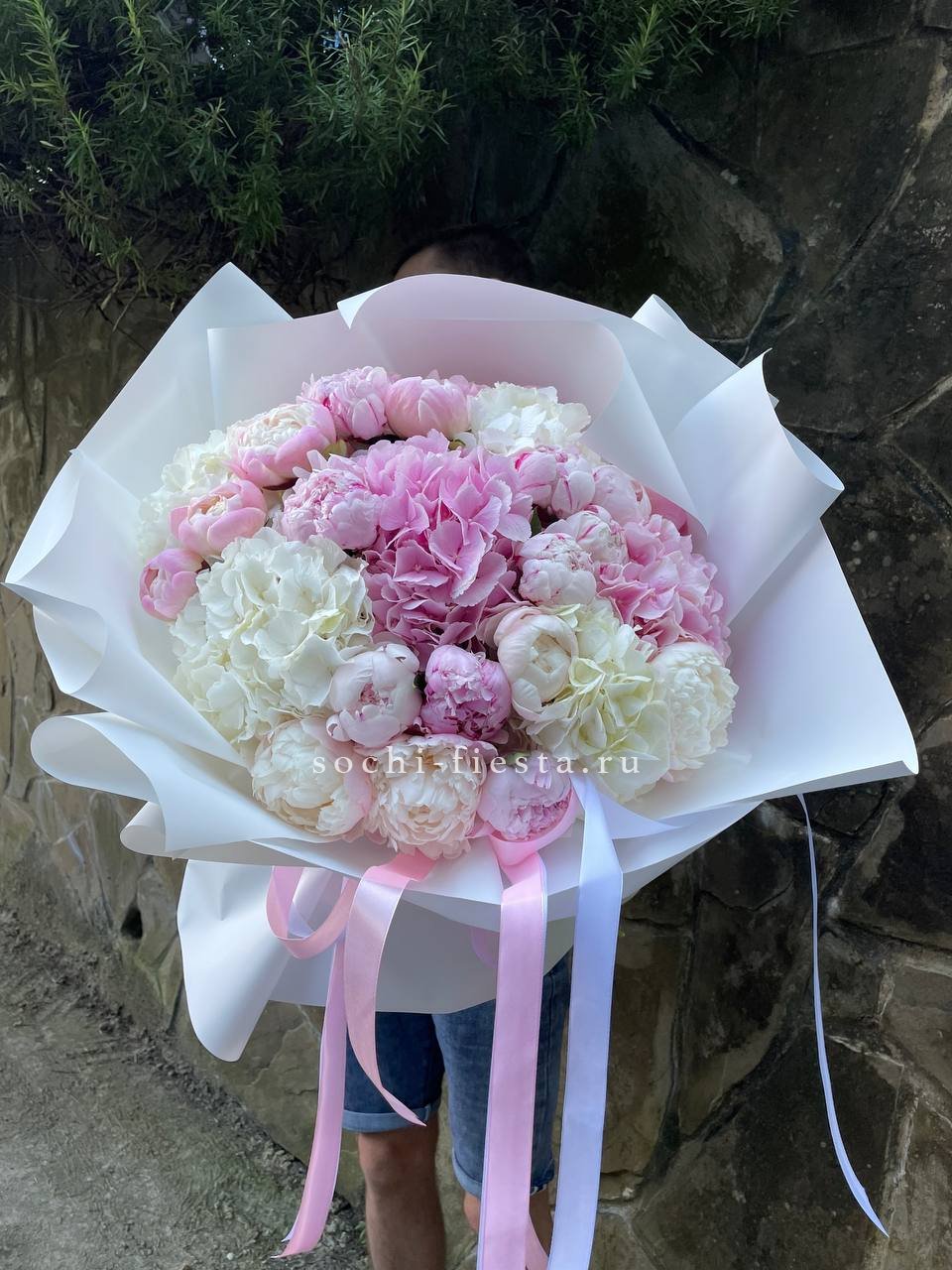 Голландские пионы и пышные шапки гортензий собраны в многослойную композицию. Разная фактура цветов создаёт визуальную игру между плотными бутонами и воздушными соцветиями.