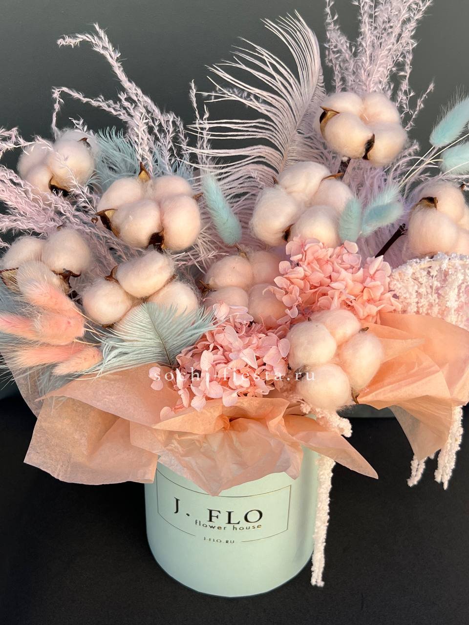 Композиция в цилиндре с лагурусом, хлопком и амарантом создает впечатление природной гармонии. Перья вносят легкость. Удобна в размещении и долго сохраняет первоначальный вид.