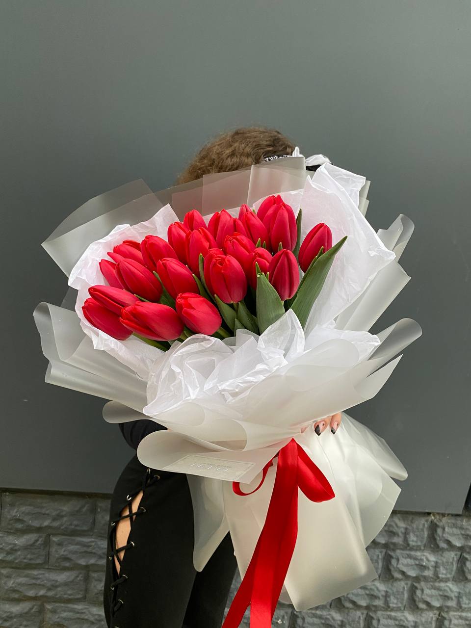 Сто один белоснежный тюльпан собран в плотную охапку с безупречной геометрией. Классическая упаковка сохраняет естественную красоту бутонов и подчёркивает масштаб композиции.