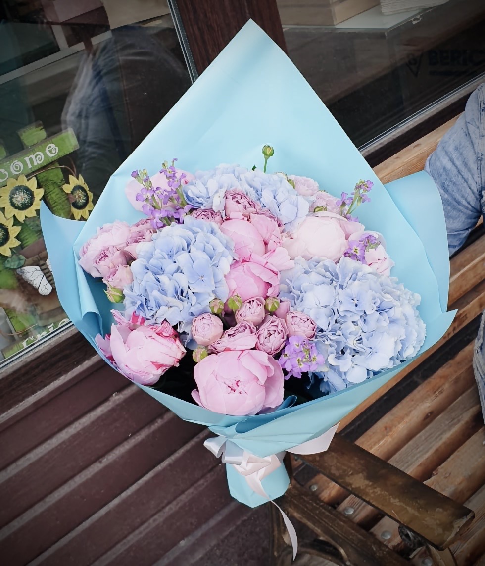 Гортензии и пионы задают основной объем, пионовидные розы добавляют мягкости, а маттиола вносит вертикальные линии. Букет выглядит наполненным и цельным.
