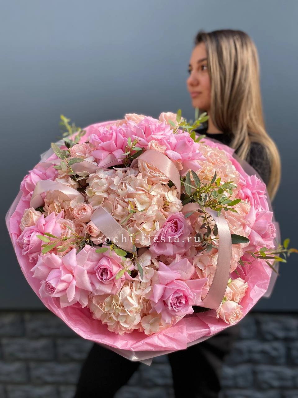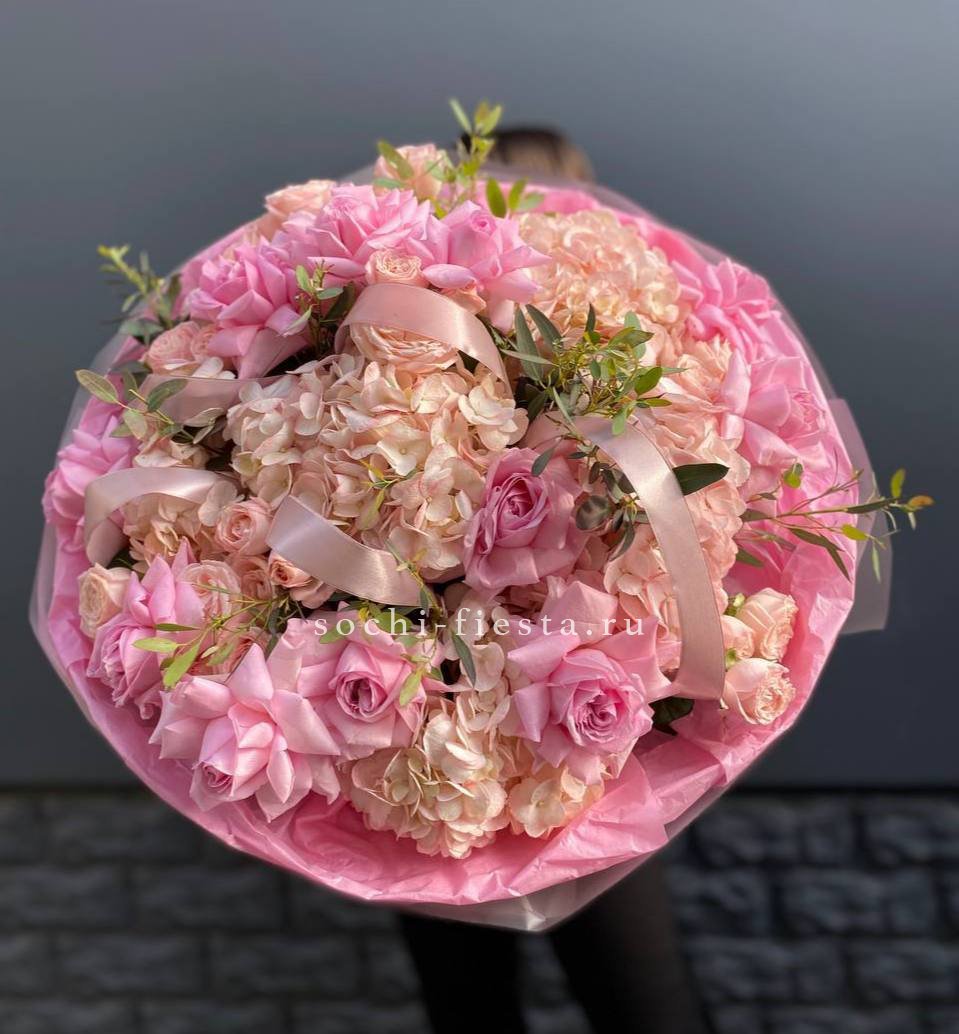 гортензии, пионы, пионовидная кустовая роза, маттиола, лента, дизайнерская упаковка.