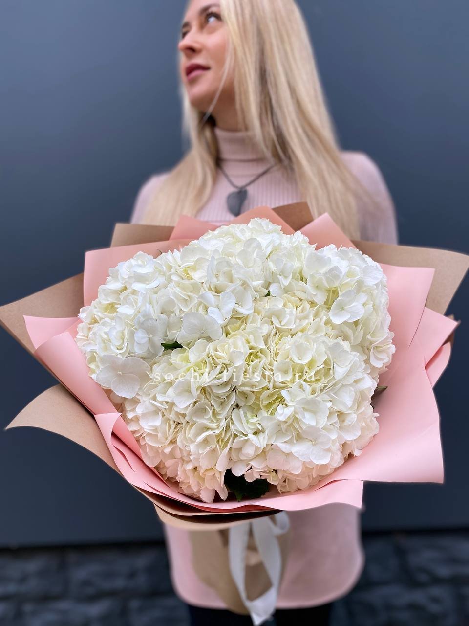 Семь белоснежных соцветий собраны в плотный объёмный силуэт. Гортензии Flakes создают ощущение летней свежести и спокойной гармонии. Монобукет для тех, кто ценит чистоту формы и природную красоту.