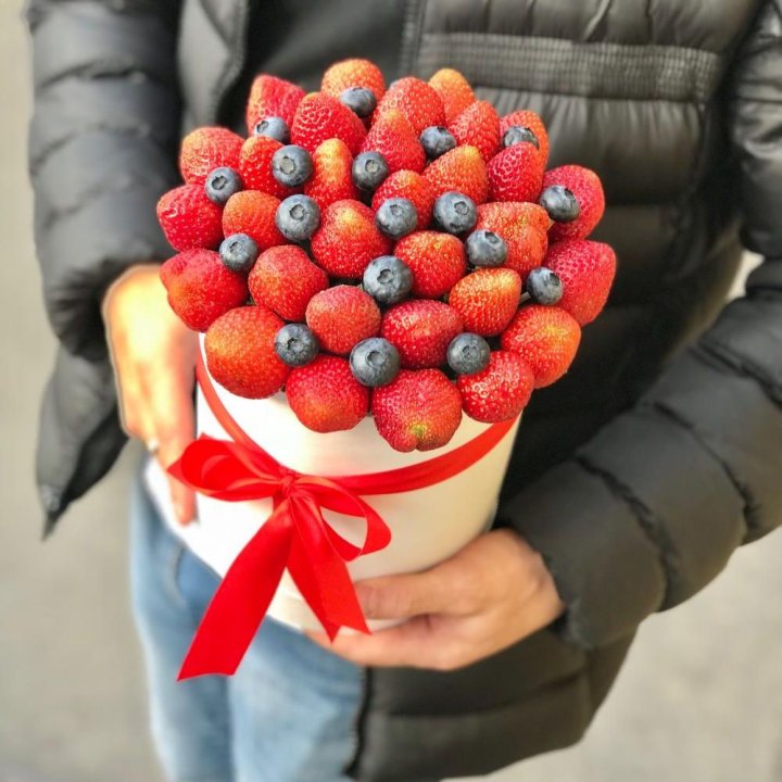 - Коробка с клубникой и цветами — шляпная коробка с ягодами и розами или пионами.