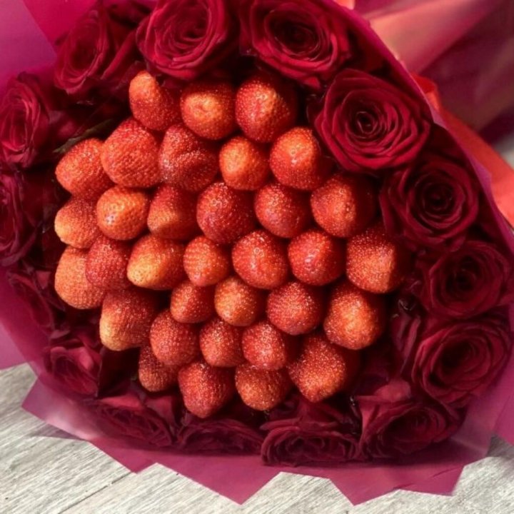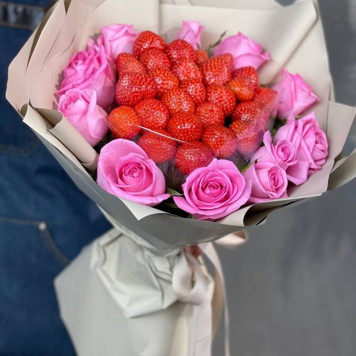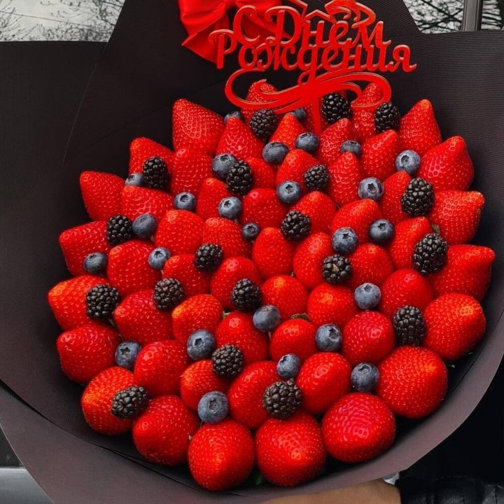 - Ягодный букет — клубника на шпажках в форме букета с живыми цветами.