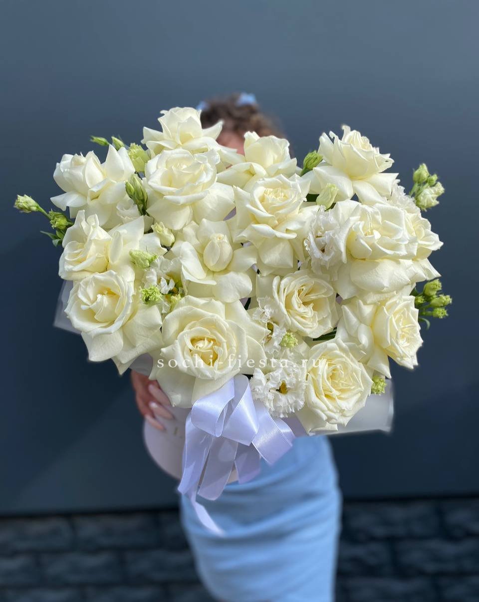 Белые розы и эустома образуют монохромную гамму с чистыми линиями. Эвкалипт добавляет свежести и завершает лаконичную форму композиции.