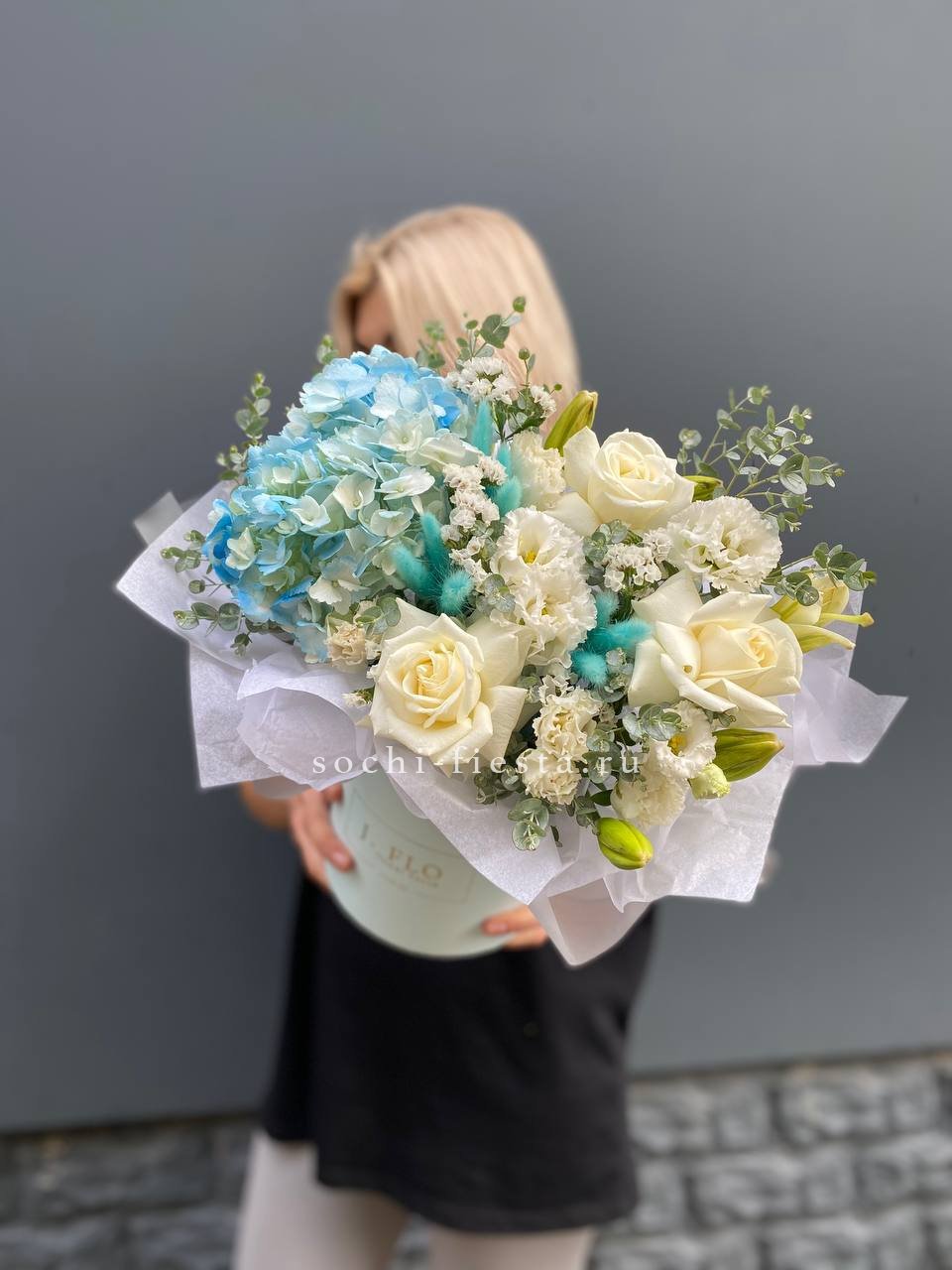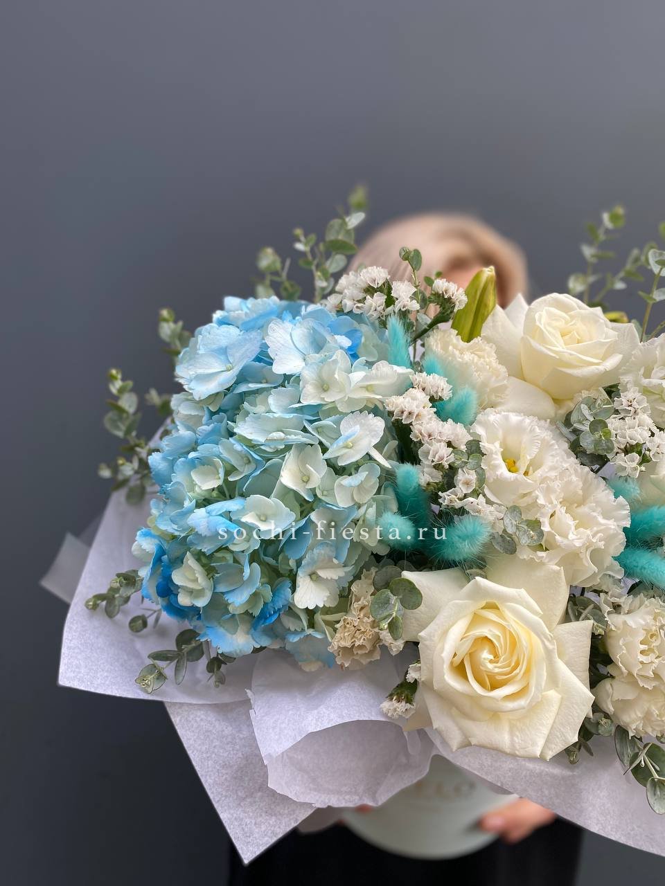 Белоснежные розы и воздушная эустома соседствуют с пышной гортензией и яркими вспышками статицы. Композиция собрана плотно, каждый цветок находит своё место в общем ритме.