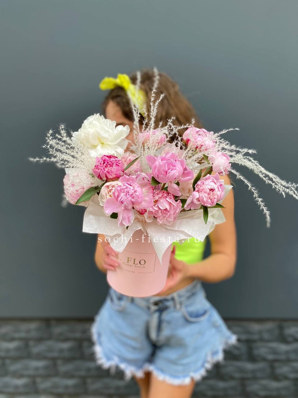 Пятнадцать пионов поднимаются над пушистыми метелками пампасной травы. Округлые бутоны контрастируют с воздушной текстурой злака. Композиция выглядит объемно при компактном основании.