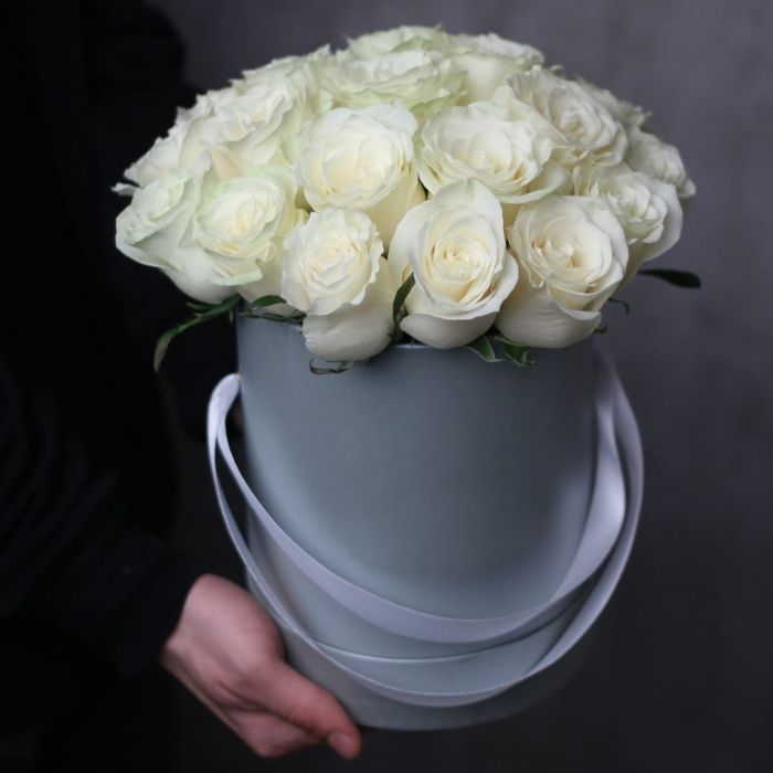 Тридцать пять бутонов розового оттенка выстраиваются в ровный купол. Эвкалипт мини проходит между розами и освежает композицию. Цилиндр сохраняет воду и позволяет цветам оставаться свежими.