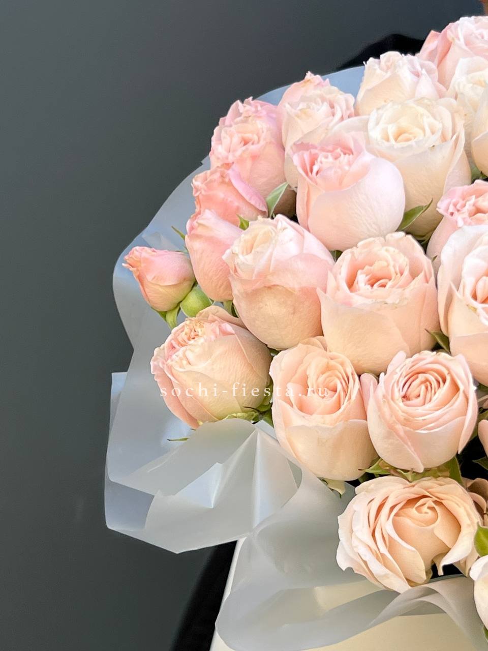 Тридцать одна веточка кустовой розы Бомбастик собрана в пышный объём. Махровые бутоны формируют dense структуру с глубокими переливами персиковых тонов.