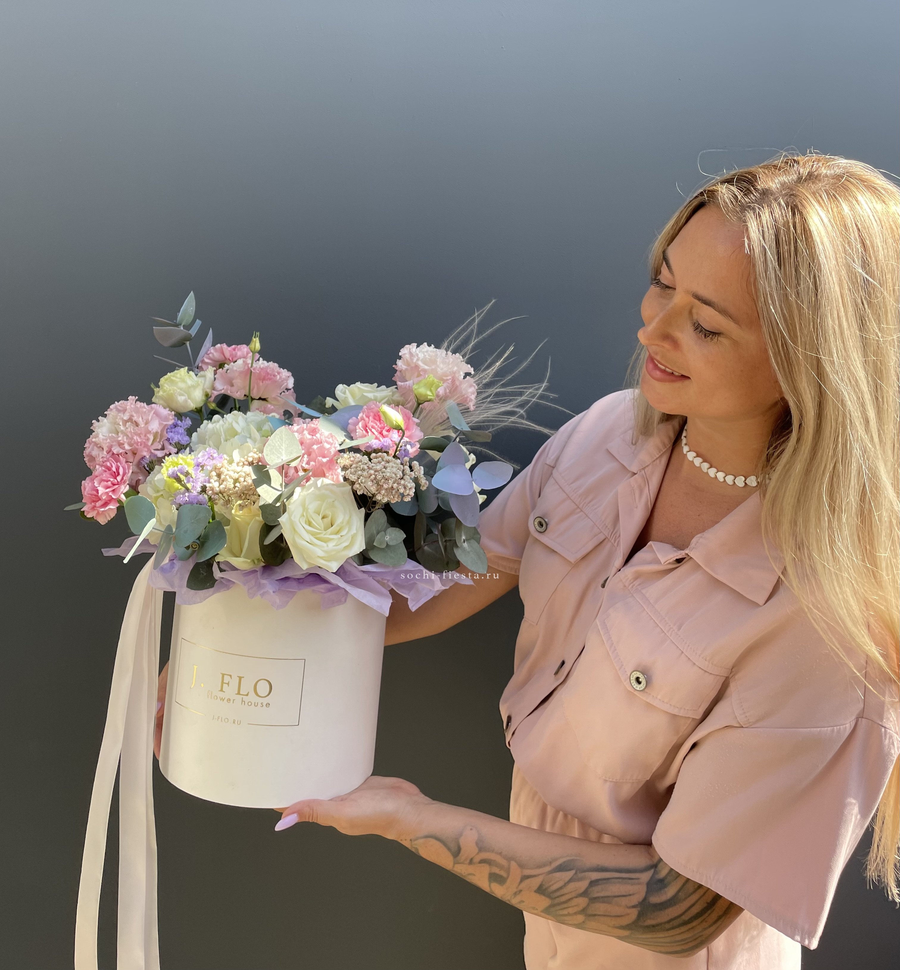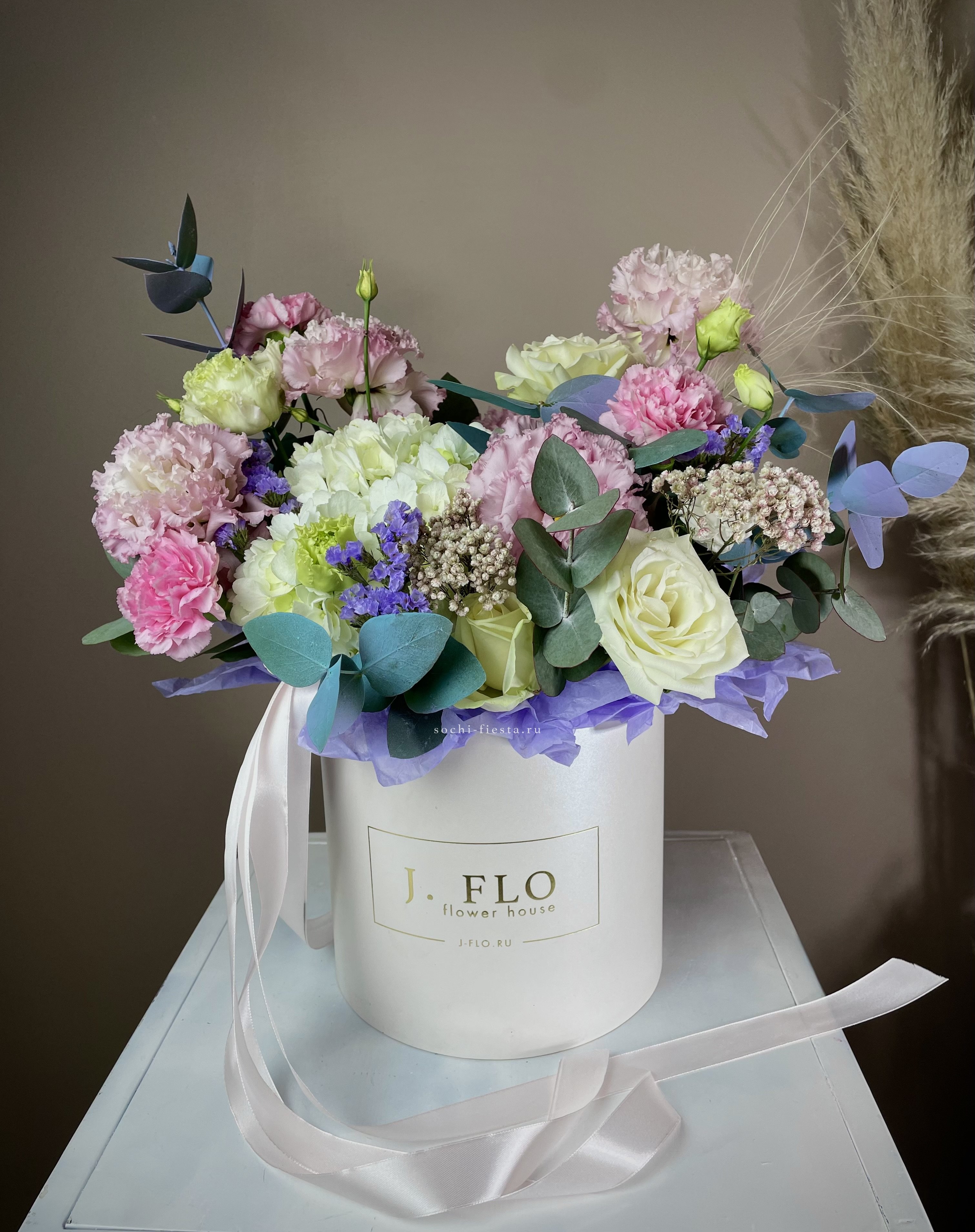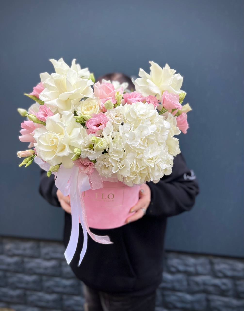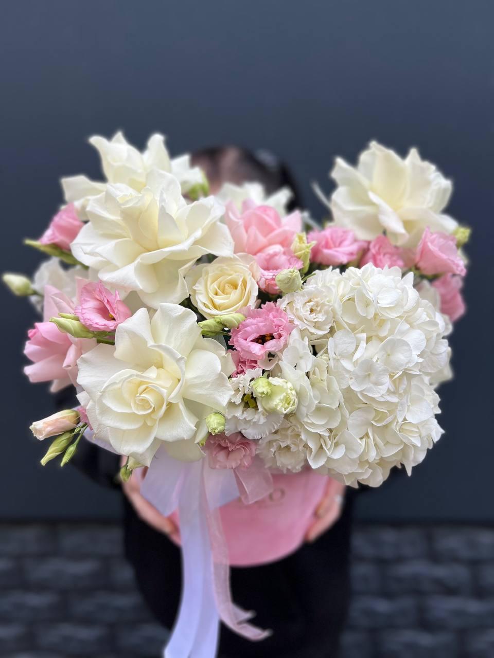 Настоящий взрыв цвета и позитива! Эта пышная и многосоставная композиция в стильной коробке притягивает взгляды богатством форм и оттенков — от нежно-розового до насыщенного белого. Это не просто цветы, а целая история о радости, празднике и восхищении. Подарок, который гарантированно произведет яркое впечатление и останется в памяти надолго.