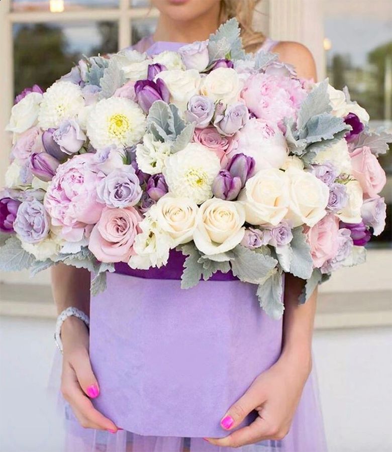 Сиреневая гамма раскрывается слоями от светлых до насыщенных тонов. Композиция заполняет пространство мягким цветом и создаёт воздушное впечатление в просторной коробке.