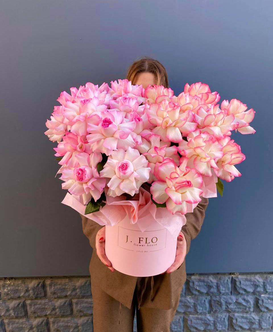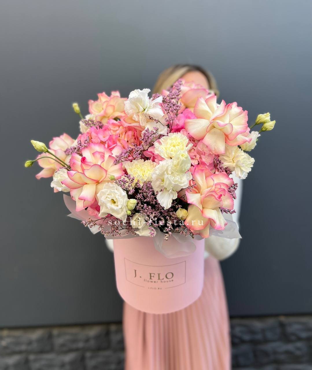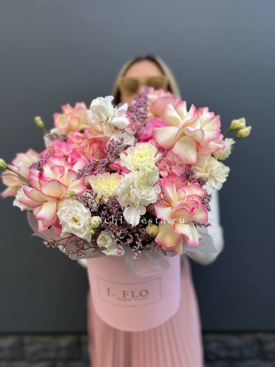 пионовидная кустовая роза, гортензия, одноголовая роза, эустома, бавардия, бокс D20.