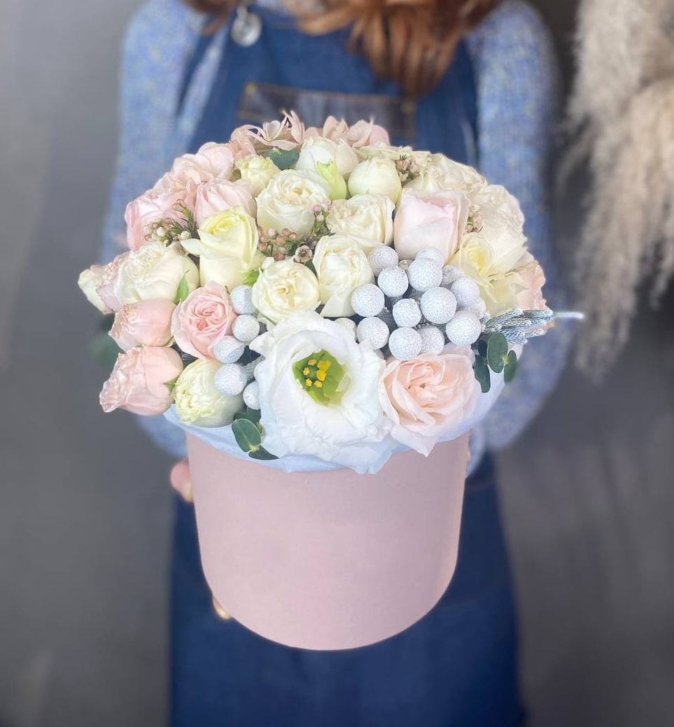 Белые пионовидные розы с объемными лепестками притягивают взгляд своей текстурной глубиной. Эвкалипт и бруния добавляют композиции природную легкость.