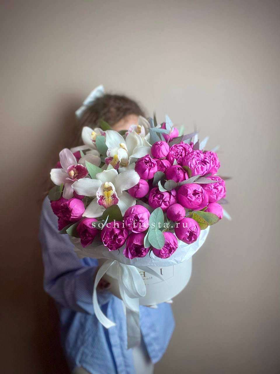 пионовидная кустовая роза Мисти Баблс, орхидея Цимбидиум, цилиндр D20, лента.