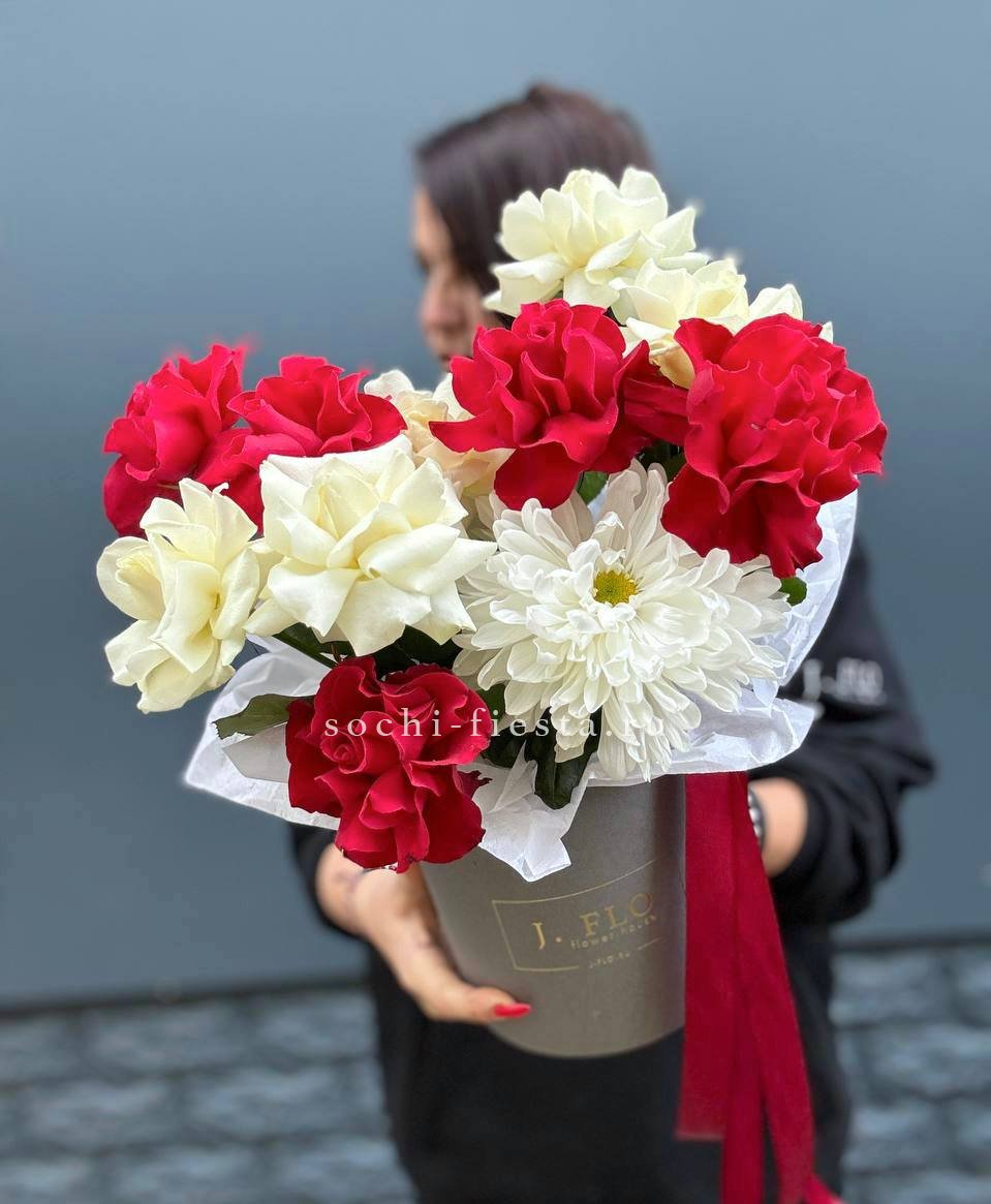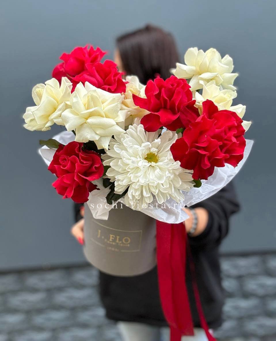 Белый и красный встречаются в одной композиции, где каждый оттенок занимает своё место. Хризантема добавляет плотности и завершает линию цилиндра.