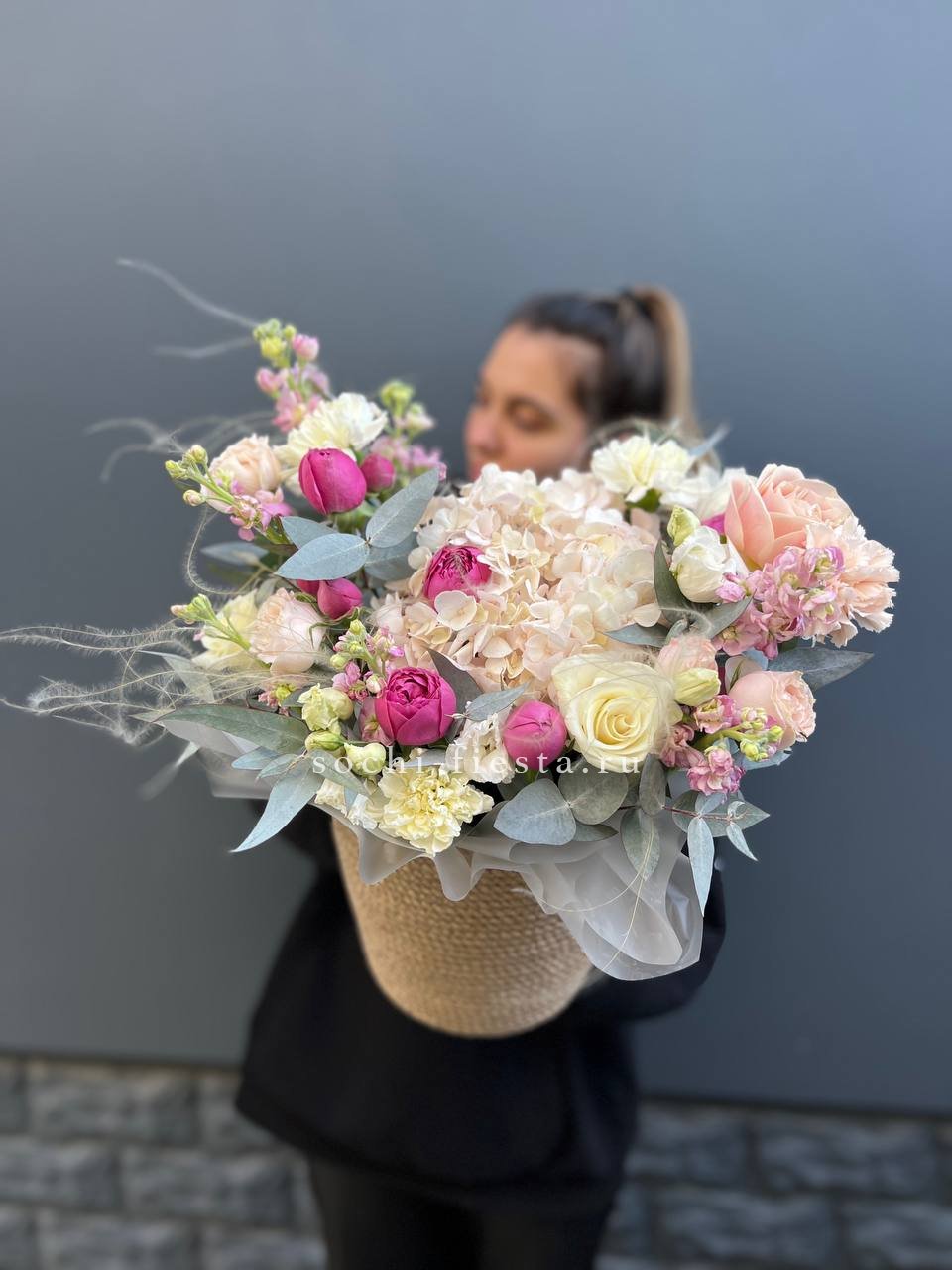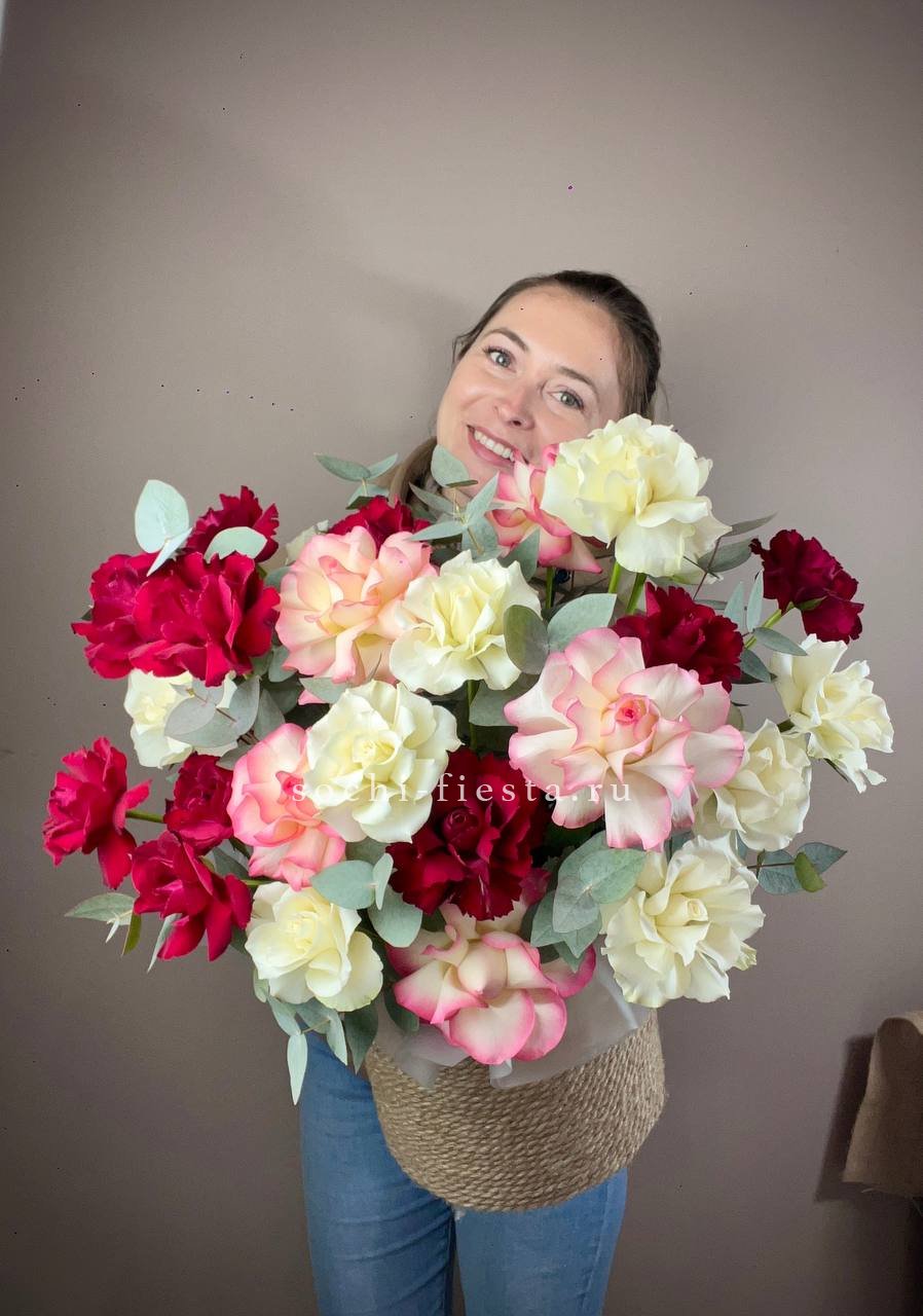 пионовидные розы Мисти Бабблс, джутовое кашпо, стифа, эвкалипт.