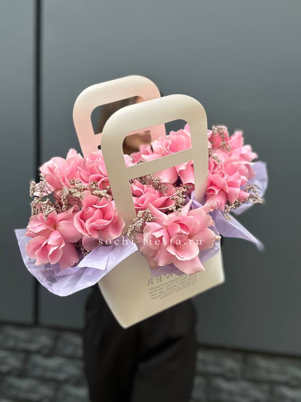 Герберы и альстромерии собраны в яркую компактную композицию. Диантусы заполняют пространство между соцветиями и создают лёгкую дымку. Удобный формат в сумке-кашпо для размещения на столе или полке.