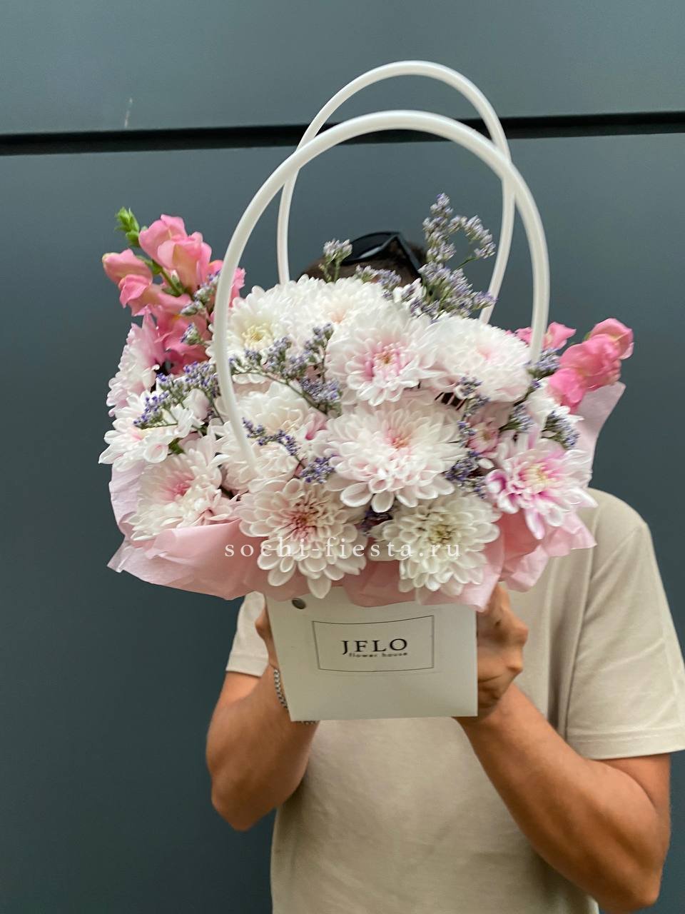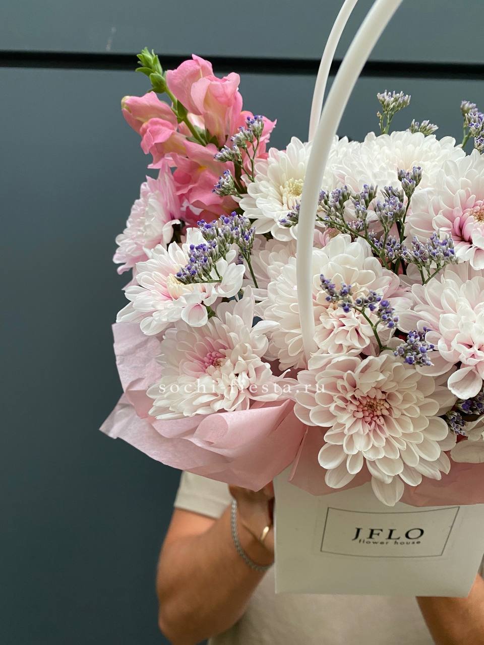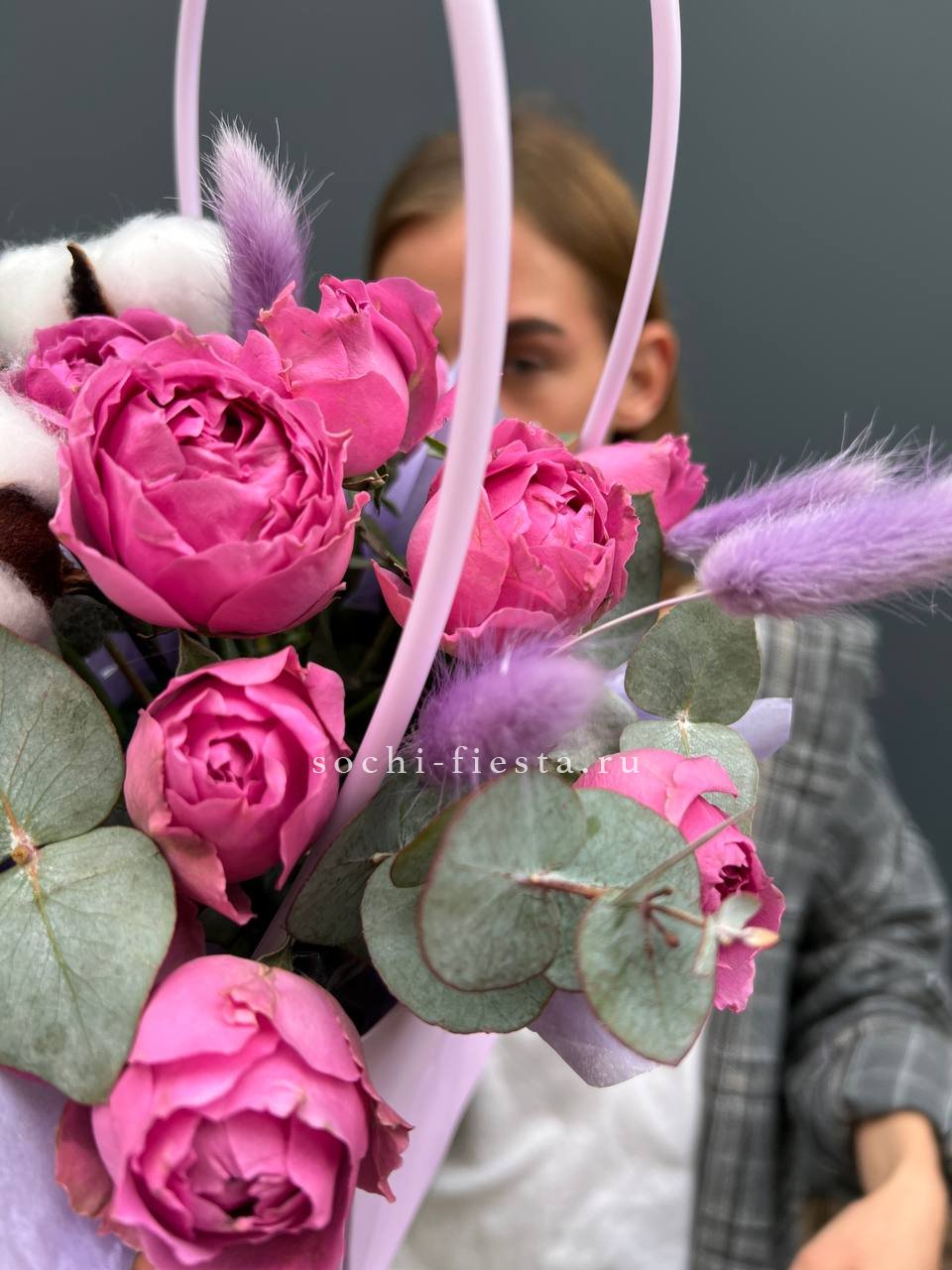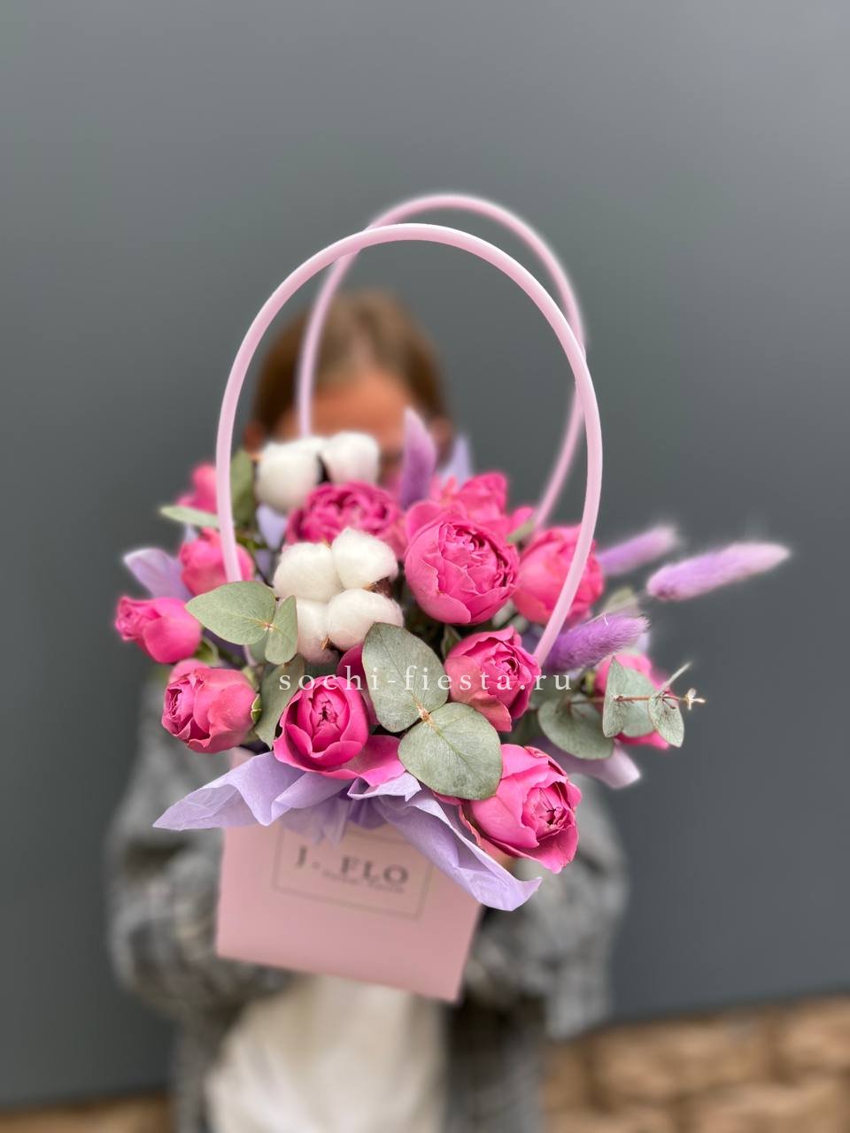 Розовые розы встречаются с орхидеей цимбидиум в объемной сумке-кашпо. Эустома и диантус создают многослойность, а кустовые розы заполняют пространство между крупными бутонами. Композиция держит форму и радует насыщенностью.