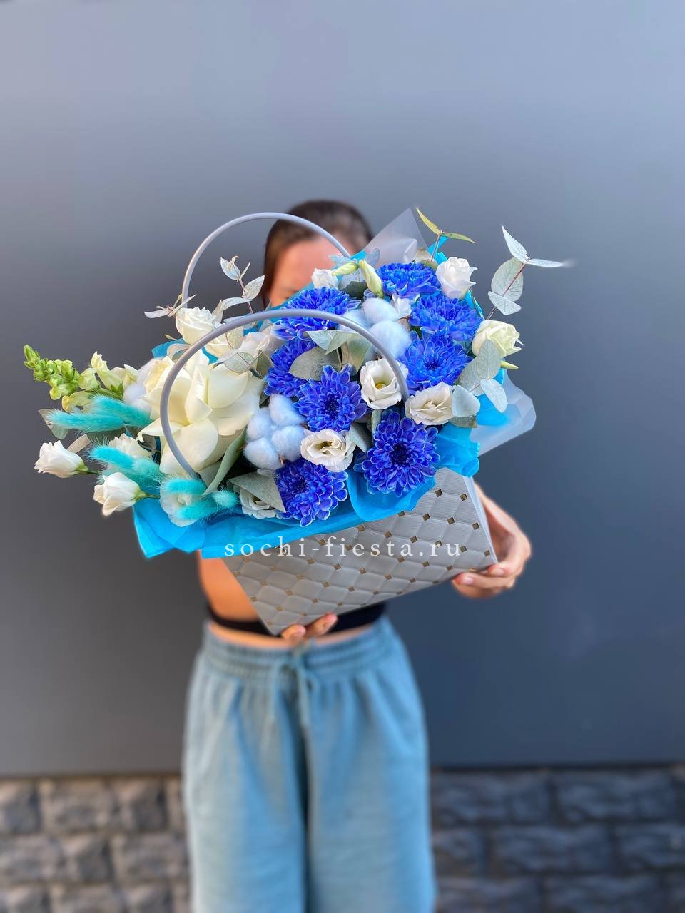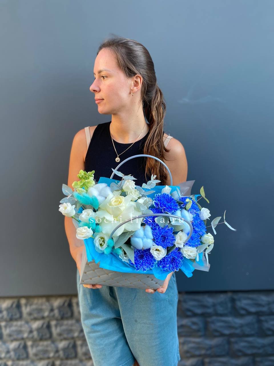 Голубая хризантема в компании воздушного лагуруса напоминает о прохладе летнего утра. Компактная форма в сумочке позволяет разместить цветы на столе или полке без лишних усилий.